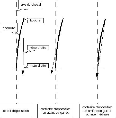 | Dire merci | je corrige 3- rene contraire sur l encolure 4- rene contraire opposition en avant du garrot 5- rene contraire opposition en arriere du garrot la 3me fait pivoter toute la partie avant donc epaules encolure ect pour aller dans une direction franche la 4me chasse surtout les hanches et incline la partie avant la 5me chasse toute le corps du cheval |