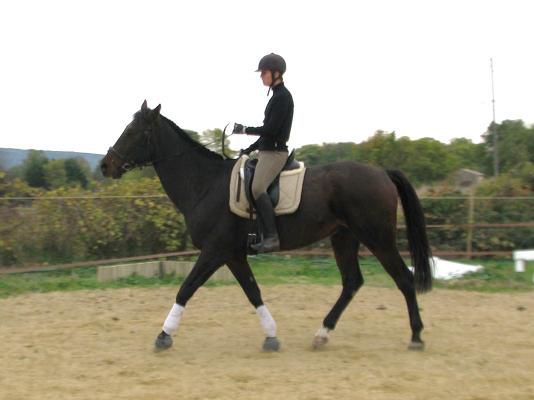 | Dire merci | bonjour à vous tous ami dresseur voila un moment que je n'ai as posté sur ce forum, cala n'empêche que je consulte regulièrement les posts avec plaisir. depuis quelques semaines j'ai un nouveau cheval en dp-travail Ko champeix, 12 ans, 180 cm au garrot, pas des masses de travail debourré depuis à peine 3 ans, travail principalement en obstacle avec sa proprio son principal défaut est une encolure droite et longue implantée basse, mais surtout musclée à l'envers avec une belle gorge de pigeon autrement c'est un cheval avec une volonté dans le mouvement en avant surprenante, qui a beaucoup de mal a passer son dos, ça se voit surtout au galop, où il écrase son garrot dans des foulée amples depuis quelques semaine je travaille avec lui principalement à le remettre dans une attitude correcte, on ne parle pas encore de "placé" juste une mise en main sommaire mais juste pour cela je travaille avec une rene colbert, qui m'a offert de très bon resullats et egalement de decontraction sur appel de rene interieure au pas et au trot uniquement neenmoins je rencontre toujours le meme soucis sur les transitions descendante le cheval se renverse s ouvre et passe la tansitions sans le dos, en ecrasant son garrot à savoir que pour mes demandes j'ai essayé toutes les alternatives possibles : avec et sans les mains, juste avec la voix, jambes et mains juste les jambes... la meilleure pour le moment jambes fermée ( pas qui agissent ) assiette et dos qui cesse d'accompagner mais je dois dire que je ne sais que faire avec mes mains pour le moment je demande une decontraction sur une flexion d'encolure avant la transition et apres, exercice qu il execute à présent très correctement, malgré une forte disymetrie à main gauche je precise que le cheval à vue l'osteopathe il y a moins de deux mois, dentiste idem l osteo lui a decelé plusieurs dorsale fortement bloquée, ainsi que le garrot pas d autre soucis notoire, juste une petite faiblesse dans le jarret droit une petite photo pour illustrer le soucis : cheval renversé au trot, je demande la cession sur une main haute ![]() selon vous que pourrais je faire avec lui pour palier à ce soucis ? |