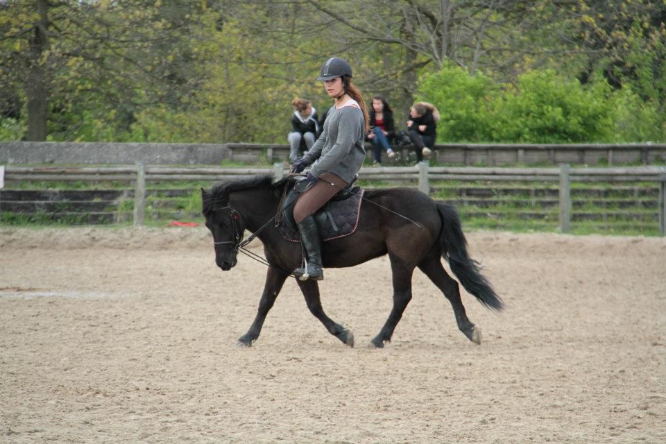 | Dire merci | Le principal commentaire qui me vient c'est : respire ! Ca peut être l'effet photo qui veut ça, mais tu as l'air plutôt tendu. Or tout le monde sait comme tu as plaisir à monter ton Pepsie, alors extériorise ! Souris, détends toi, ça décrispera tes épaules.La seule chose qui doit être tendu à cheval, c'est ta ligne du dos (et toute la difficulté est bien d'arriver à décontracter tout le reste). Même commentaire pour tes jambes, ça va avec. Après dans une optique "pur dressage", on pourrait te demander un dos plus en arrière, mais ça dépend ce que tu cherches ici... Pour moi là tu es dans une position "je ne gêne pas le cheval", tu es toi même un peu en avant parce que lui même est un peu sur les épaules. C'est déjà pas mal. Mais pour demander des choses, il faut que tu acquiers plus de décontraction pour que tes jambes soient à leur place, ton dos et tes épaules aussi pour gagner en précision au niveau des mains. |