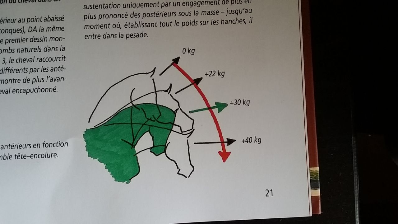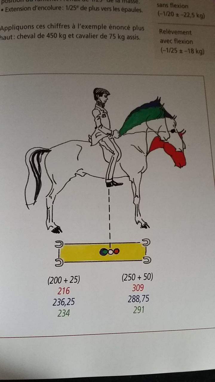 | Dire merci | Tes tests sont fatis sur un cheval à l'arret. Ta photo montre encore un cheval à l'arret. L'équilibre du cheval a l'arret est pas celui du cheval en mouvement. Regarde la photo de mon cheval si on le prenait tel quel et on le mettait sur ta balance à animaux quel serait le résultat ? une énorme surcharge des antérieurs ! En mouvement le cheval perd et rattrape son équilibre statique dans une même foulée. Tout ça pour dire que tes questions de poids concernent que l'équilibre statique. C'est parce que les cavaliers font cette erreur qu'ils comprennent pas ce qu'est l'équilibre, et qu'il croit qu'on l'atteint qu'en fin de dressage et qu'en attendant c'est pas grave si le cheval est pas équilibré. |