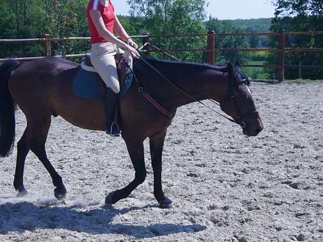 DéconnectéDire merci | Pour la photo où il s'inverse, je suis d'accord avec sita : en fait, il et en lutte contre ta main qui le bloque. Ne cherche pas à le placer, mais libère le, cherche à avoir une main neutre dans ces cas là. Tu as là, plusieurs solutions : tu peux avancer tes main, pour le "lâcher" et le laisser prendre une attitude plus décontractée. Tu peux garder tes mains en place (mais on est d'accord, sur la photos, elles ne le sont pas (pense à placer tes mains qui doivent se placer à partir des épaules)) et le laisser se "débrouiller" dans le cadre que tu lui donne. L'inconvénient de la première manière, c'est que ça va tendre à le mettre sur les épaules. La, deuxième devrait l'obliger à s'équilibrer, mais en passant par une sorte de lutte (qui de toutes façon est relativement inévitable : il a découvert comment évoluer tranquille... Pour l'instant, à savoir, sur le pif ! a long terme, c'est au détriment des jarrets et des genoux) Par contre, je suis de l'avis de Pilatus, il lui faut des cercles... Je suis aussi d'accord avec lui quand il te dit que ton cheval sort ses hanches de sa trajectoire. La vidéo : Tout d'abord, arête de gigoter : garde ton buste à sa place, car c'est en parti cela qui permet à ton cheval de rester sur les épaules. N'utilise tes jambes que le moins possible : une fois, et ça réagit : là elles fonctionnent tout le temps et c'est inefficace. Il est au fraise, heureux comme ça, certes : il se promène : avachi devant et les postérieurs qui se promènent derrière. Par contre, il a une bonne activité, et me semble bien fonctionner. ajuste tes rênes pour ne pas le laisser s'avachir, et travaille dans le cadre que tu lui donnes; Je pense que là, il a besoin que tes rênes soient tendues (ce qui ne veut pas dire de tirer mais d'être au contact, et de ne pas sanctionner s'il s'appuie, plutôt d'y remédier par la mise en avant, le cercle et de l'accepter tant qu'il en a besoin, ou qu'il n'a pas compris) pour qu'il ait une limite à ses possibilités d'échapper au travail. S'il se "fâche" fait des morceaux de cercles : alterne quelques pas sur le cercle, quelques pas sur le droit, en changeant souvent de main. Ne mets de jambe que pour le remettre en avant sur le droit, sinon, elle ne sont là que pour "encadrer" et molles. Il a une bonne attitude globale (disposition), mais pas de travail maintenant, il faut qu'il"s'y mette" Tout dépend de ton attitude à toi sur le cheval, travaille cela en priorité, tu verras qu'au fur et à mesure que tu te placeras sur ton cheval, son équilibre à lui va s'améliorer. (Oliveira, balancier global et ce genre de choses) |