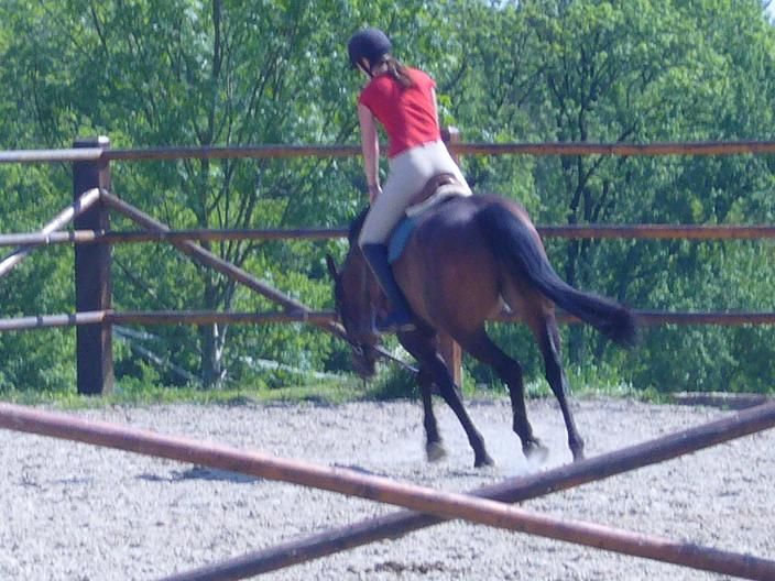 | Dire merci | Il serait peuetre tres tres utile de travailler à pied, car il est tendu dans sa machoire et sa nuque, donc globalement pas dans le "bon sens". Cession de machoire à pied 2 ou 3 avant et apres le travail ... Le truc c'est que cela ne s'improvise pas, faute d'avoir un prof achete un ou deux bon bouquins ("Derives du dressage moderne" et "Gymnase et dressage" . Pour ce qui est des cercles : le cercle n'est interressant que s'il est suivit d'une ligne droite ! donc pas de cercles perpetuels, un cercle puis 15/20metre en avant et droit, ect. Commence par des diametres tres tres larges, on fait souvent l'erreur de mettre les chevaux trop tot sur de petits cercles. |