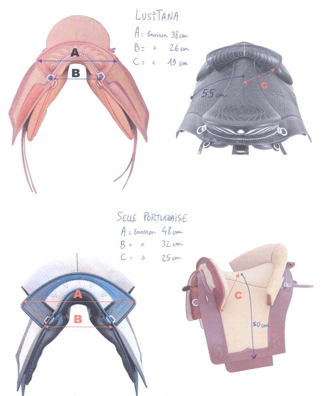 | Dire merci | j'ai pris la plus petite taille, la 38 Je vais ENFIN avoir une portugaise à ma taille Elle fait 30cm de siège comme la ronda ibérique de chez Ludomar. Ca correspond à du 16,5 / 17 en selle anglaise |