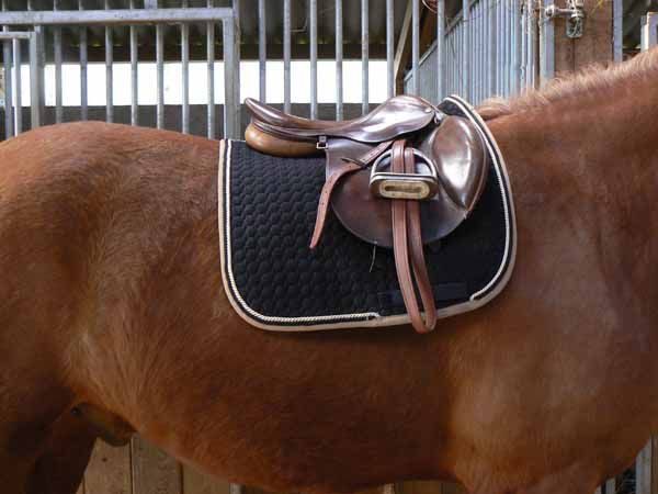 | Dire merci | J'ai reçu mon HKM... c'est un "element", avec un piqué particulier, juste épais comme il faut (qqs millimètres), assez raide, bien dégarroté, et il bouge pas d'un poil sous la selle... Passé en machine, juste un peu "bouloché", mais sinon nickel. |