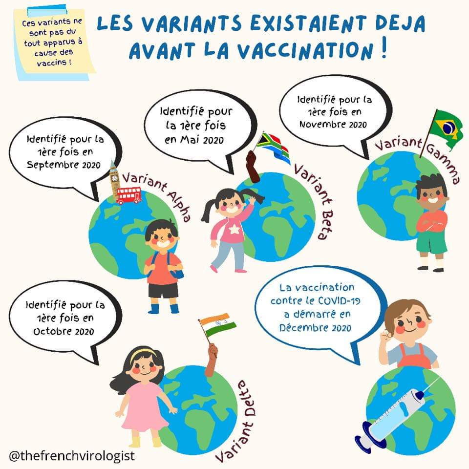 | Dire merci | les antivax disent que c'est les vaccins qui créent les mutations Ce qui ne marche pas Les variants sont apparus avant les vaccins Dans cet article de Marc Gozlan, il est question des analyses phylogénétiques qui permettent de dater les variants Lien Un résumé plus succinct par thefrenchvirologist Dates d'apparition des variant alpha/beta/delta/gamma : entre mai et novembre 2020 Date de début des campagnes de vaccinations : Décembre 2020/Janvier 2021 |