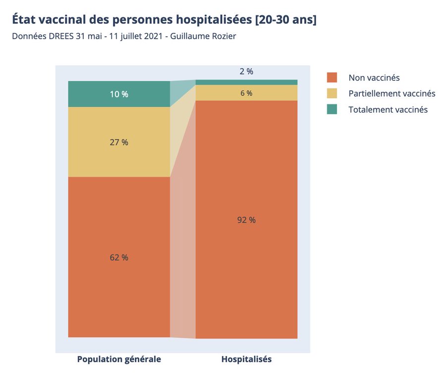 | Dire merci | En effet il y a quelques sources ![]() Toujours avec ma source Drees, concernant les jeunes puisqu'on se posait plus haut la question de la pertinence pour eux : "La vaccination permet de réduire les hospitalisations, même chez les jeunes. 92% des 20-30 ans hospitalisés ne sont pas vaccinés, alors qu’ils représentent 62% de leur tranche d'âge." (11% de la population générale) NB : il ne s'agit pas seulement des hospis covid mais de l'ensemble des hospitalisations, c'est donc une extrapolation. [Bien sûr, plus la population vaccinée va augmenter, plus leur % d'hospitalisés va grimper . S'il n'y avait QUE des vaccinés, le % d'hospitalisés vaccinés serait de 100% ) Message édité le 31/07/21 à 11:18 |