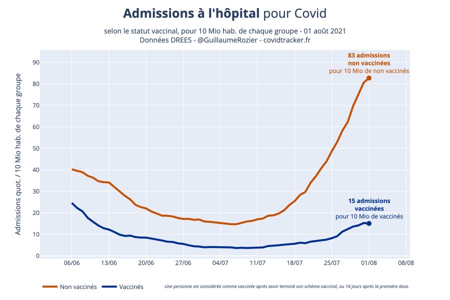 | Dire merci | Qq Chiffres (Guillaume Rozier) Les nouvelles données de la DREES sont disponibles (jusqu’au 1er août). En moyenne chaque jour, pour 10 Mio de chaque groupe, il y a : • 2 311 cas symptomatiques chez les non vaccinés • 330 cas symptomatiques chez les vaccinés Chaque jour, pour 10 Mio de chaque groupe : • 83 admissions à l’hôpital chez les non vaccinés • 15 admissions à l’hôpital chez les vaccinés Chaque jour, pour 10 Mio de chaque groupe : • 34 admissions en soins critiques chez les non vaccinés • 4 admissions en soins critiques chez les vaccinés Chaque jour, pour 10 Mio de chaque groupe : • 7 décès hospitaliers chez les non vaccinés • 1 décès hospitalier chez les vaccinés Impact de la vaccination sur le Covid : Lien Commentaire pour les admissions à l'hôpital : "C’est d’autant plus impressionnant que les vaccinés sont plus âgés donc probablement plus fragiles, plus susceptibles de faire des formes graves." Et la covicarte des vacances 😬 |