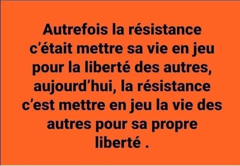 | Dire merci | heu, laska je crois que tu t'emballes sur une incompréhension du message de base de Swann, là. Je crois qu'elle a mis cette citation car beaucoup d'Anti-vax ou même anti-pass sanitaires se comparent justement à des résistants face à un Etat dictateur. Or la phrase souligne que cette comparaison n'a pas de sens car les résistants d'avant risquaient leur vie pour le bien collectif alors que dans la situation actuelle, cela semble être l'inverse. Swann en elle-même ne se compare à rien du tout... Ou alors c'est moi qui n'ai rien compris... ![]() |