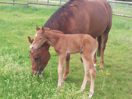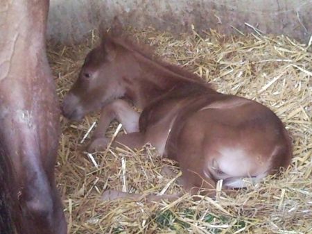 | Dire merci | oui c'est une alezane tout ce qu'il y a de plus normal, la peau se pigmente en quelques jours. pour info, les alezans qui deviendront gris naissent avec les muqueuses déja foncées. Donc pour un poulain alezan qui a un/deux parent(s) gris on est tout de suite fixé sur sa future couleur. Ici : alezan qui restera alezan. |