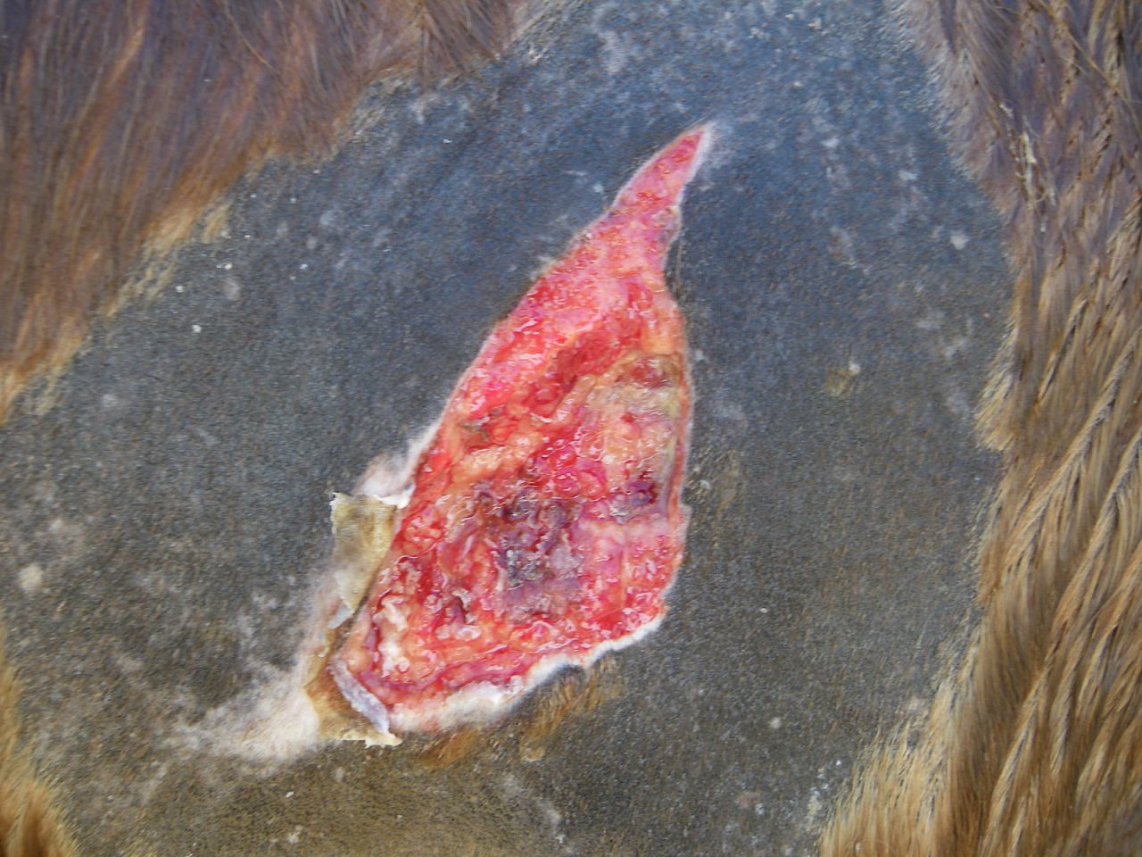 | Dire merci | la douche pour enlever les parties nécrosées, désinfecter et du Cothivet. J'ai vu un cheval qui avait le poitrail tout arraché se reconstituer, mais patience, c'est long, je dirais 3 mois acant qu'on ne voit plus rien |