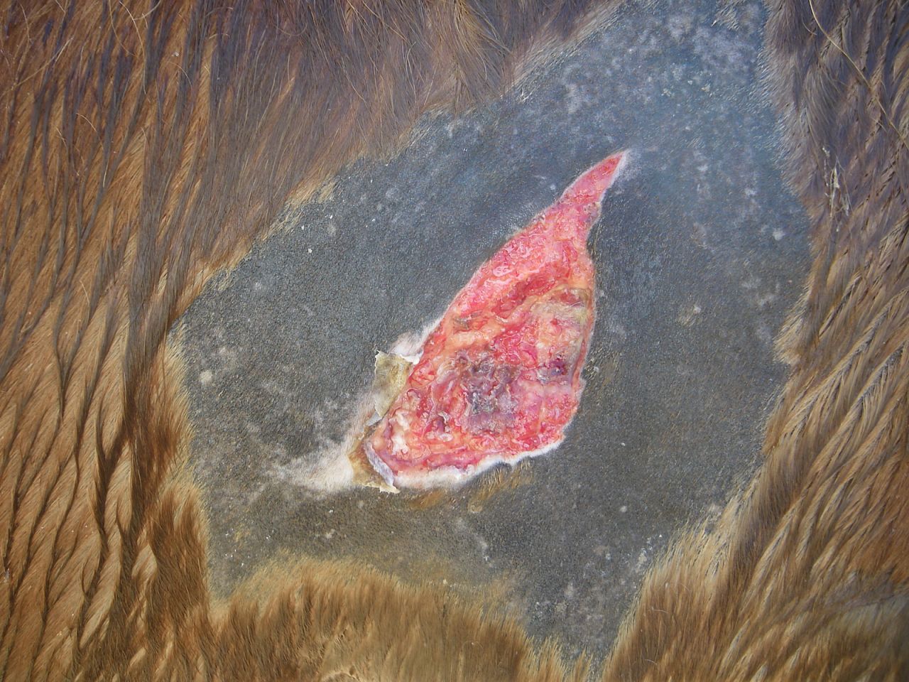 | Dire merci | J'ai eue le même problème mais avec une branche dans un enclos... Mon véto m'a simplement dit de nettoyer avec le jet d'eau en pression sur la plaie et de finir a la bétadine. Je sais ça paraît bizarre comme soins mais ça a été nickel!Plus aucune trace du bobo. (Le muscle avait été déchiré aussi) |