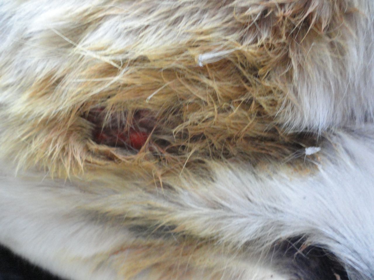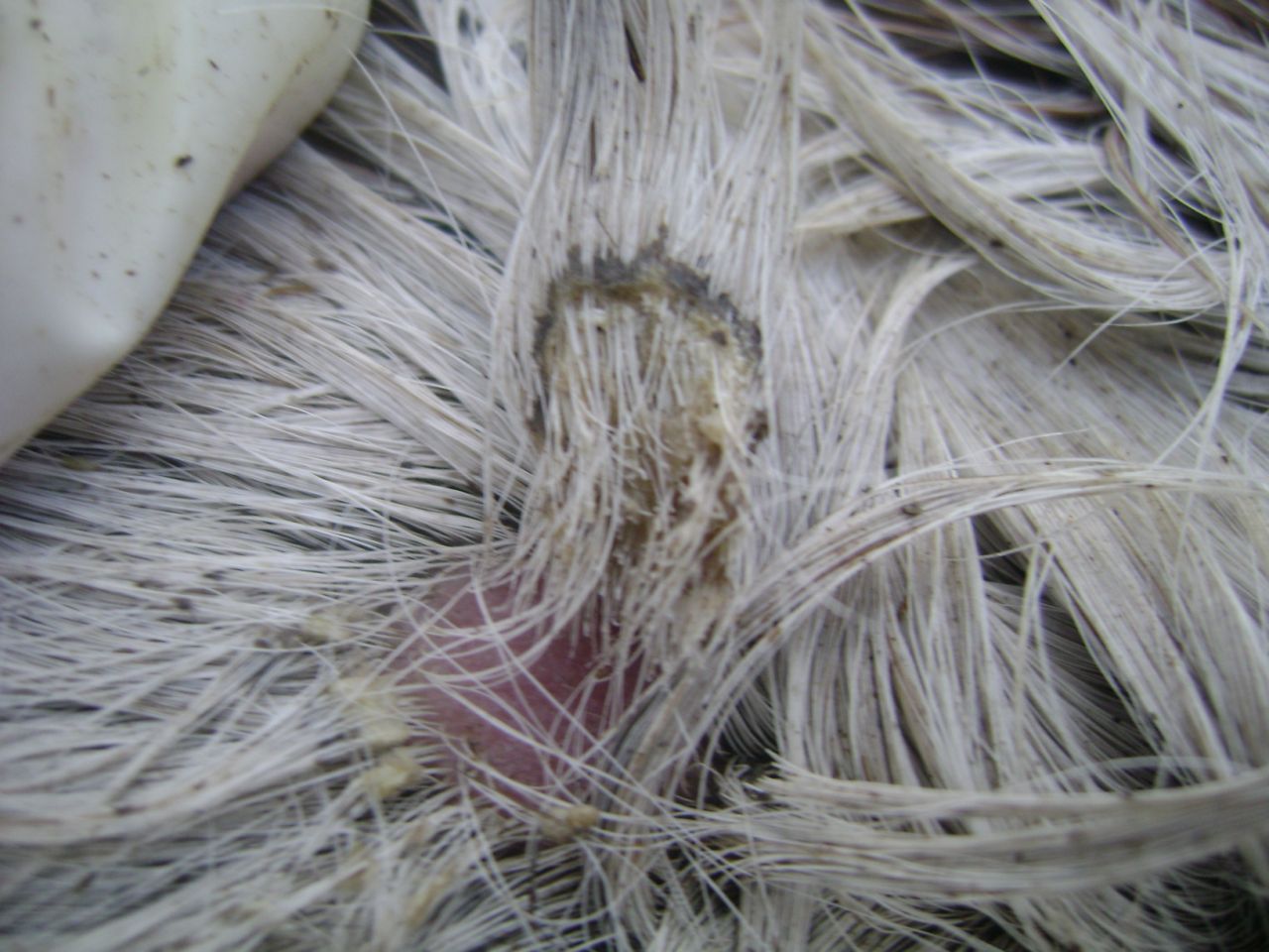 | Dire merci | Dermatophilose ! laver les lésion à la bétadine scrub puis les secher avec un coup de bétadine jaune (ou povidone = générique moins cher...) C'est du à l'humidité d'automne. |