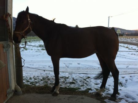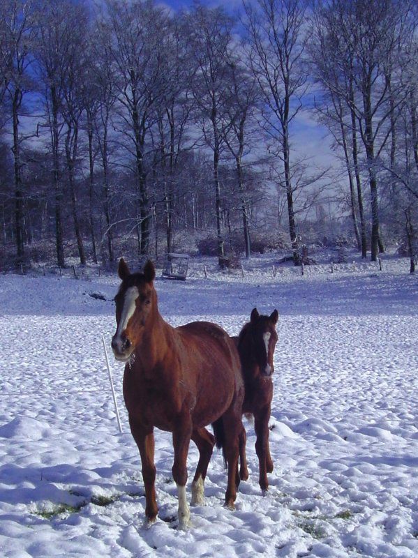 | Dire merci | Kervérone cet hiver dans la neige avec son rejeton Aéronlio Demaimbourg. Aujourd'hui il est aussi grand qu'elle au niveau croupe, mais a toute la couleur de son papa.![]() |