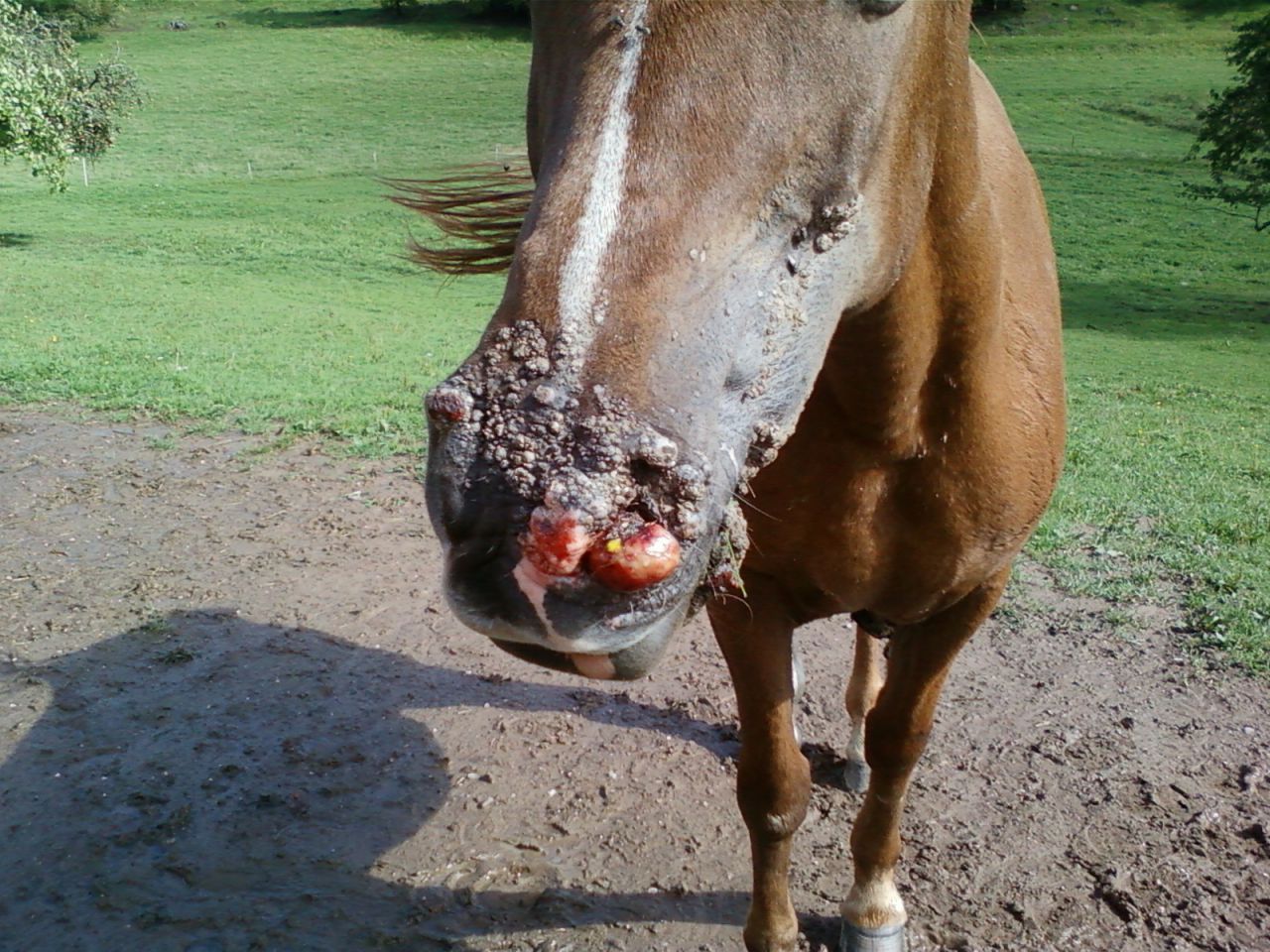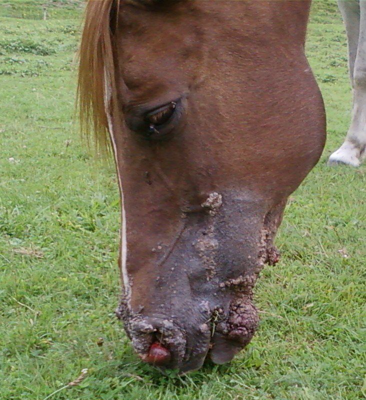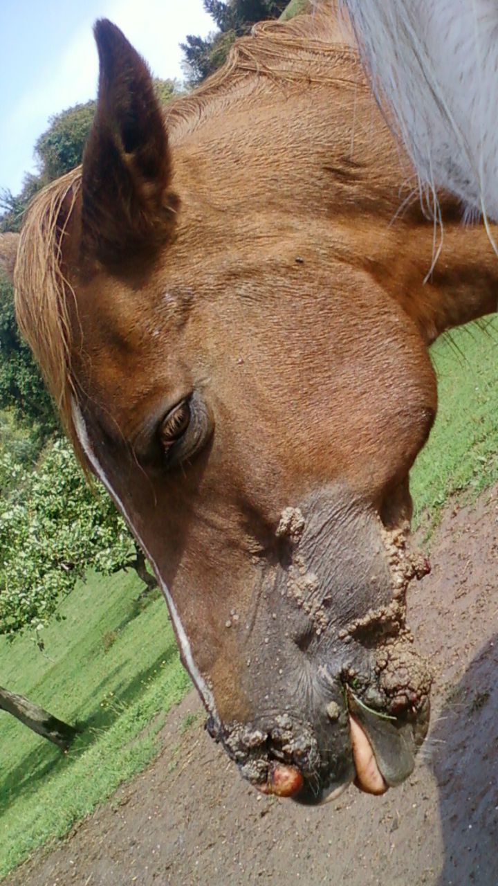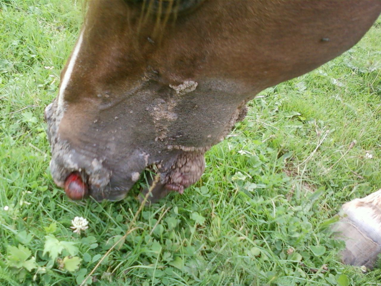 | Dire merci | Le véto a bien reçu les photos de Laura, il a donné du LOTAGEN et dit d'arrêter l'ALDARA pommade humaine pour les verrues mal placées que le Professeur de Liverpool avait conseillées avant de décider qu'il fallait faire 5 injections d'INTERFERON ROFERON A Faroud a eu ses 5 injections. Donc il m'a dit LOTAGEN dans le naseau et continuer ALDARA ou ACCICLOVIR sur les autres mais qu'ALDARA si j'en avais encore que cela était plus FORT. Bien sûr ALDARA coûte la peau des f...... mais j'en ai eu 2 boîtes. C'est peut être l'ALDARA qui a fait percé "la chose" dans le naseau a dit le véto et maintenant de ne mettre plus rien que du LOTAGEN et s'il faut l'enlever il le ferait chirurgicalement quand il y aura moins de mouches et de chaleur. Je suis en contact avec Cendres de Lune. Elle pense que cela pourrait venir aussi du fait que nos chevaux sont dans des parcs voisins de ceux des vaches et que dans les Vosges les parcs sont en pente. FAROUD est né le 7 Mai 1993 et il est rond pour un Arabe d'1 M 48. Et dire que cela n'a commencé que par une verrue plate sur la joue ! |