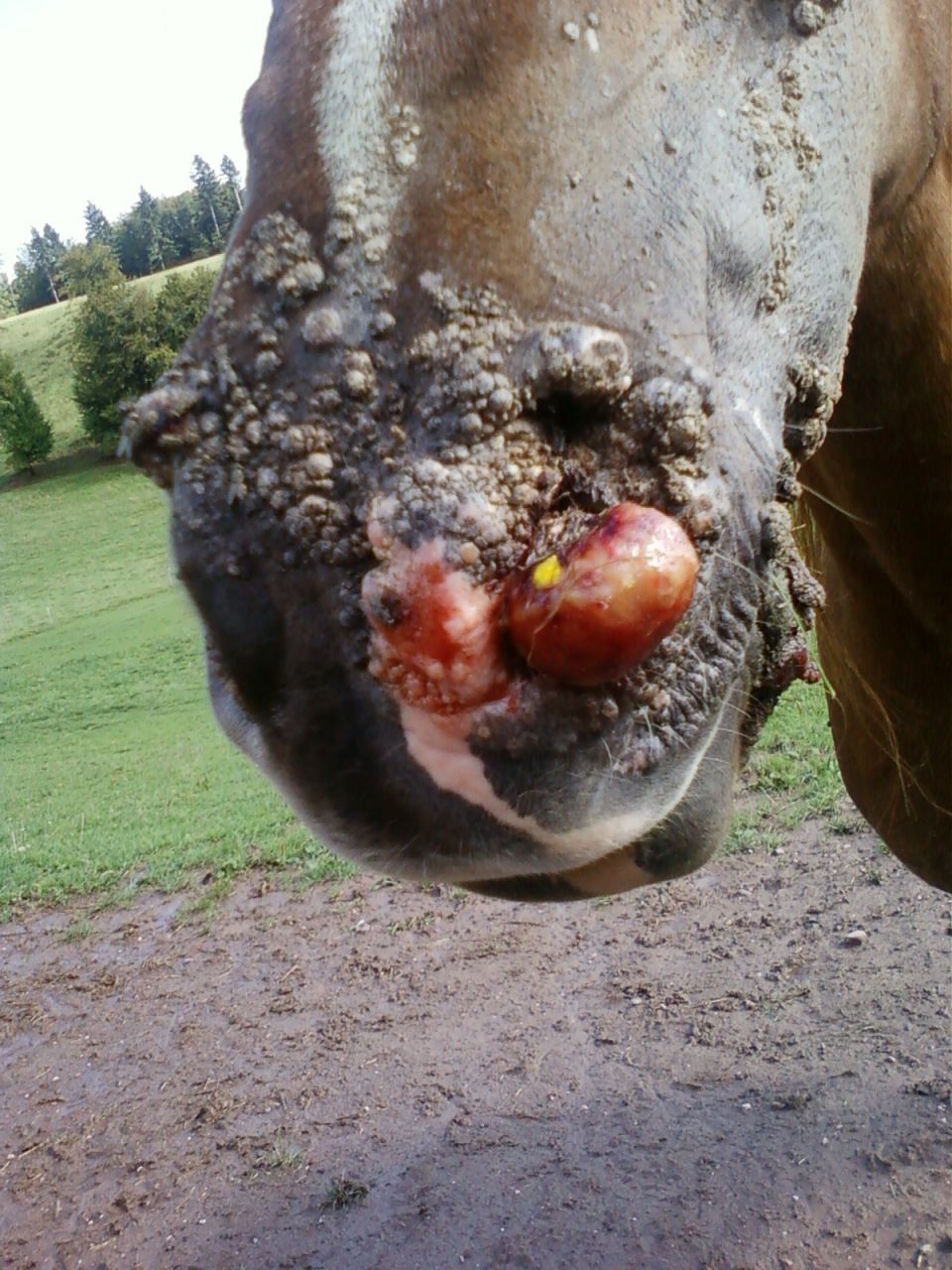 je le tenais au licol et le véto a enlevé l'énorme boule dans le naseau afin qu'il puisse respirer. Il a dit qu'il n'y avait pas de racine. Il a suturé avec du fil et je dois nettoyer à la bétadine. Pour la grosse chose entre les deux antérieurs qui pend et est revenue après l'élastique à moutons posé par un de ses collègues il a dit qu'il fallait la laisser comme cela car il y avait des racines. Et que cela ne le gênait pas trop puisqu'il était "cheval de compagnie". Le principal était de lui enlever la chose dans le naseau afin qu'il puisse mieux respirer et aussi qu'il puisse manger dans son seau sans que cette énorme chose touche les bords du seau et lui fasse mal et puis qu'il mette du mauvais sang partout.