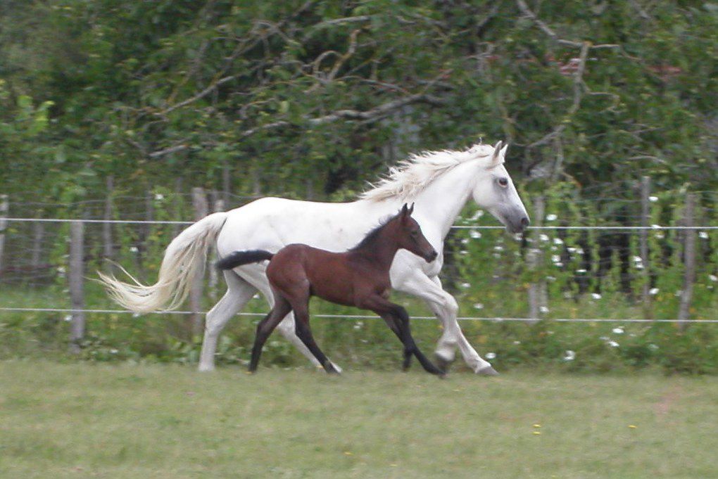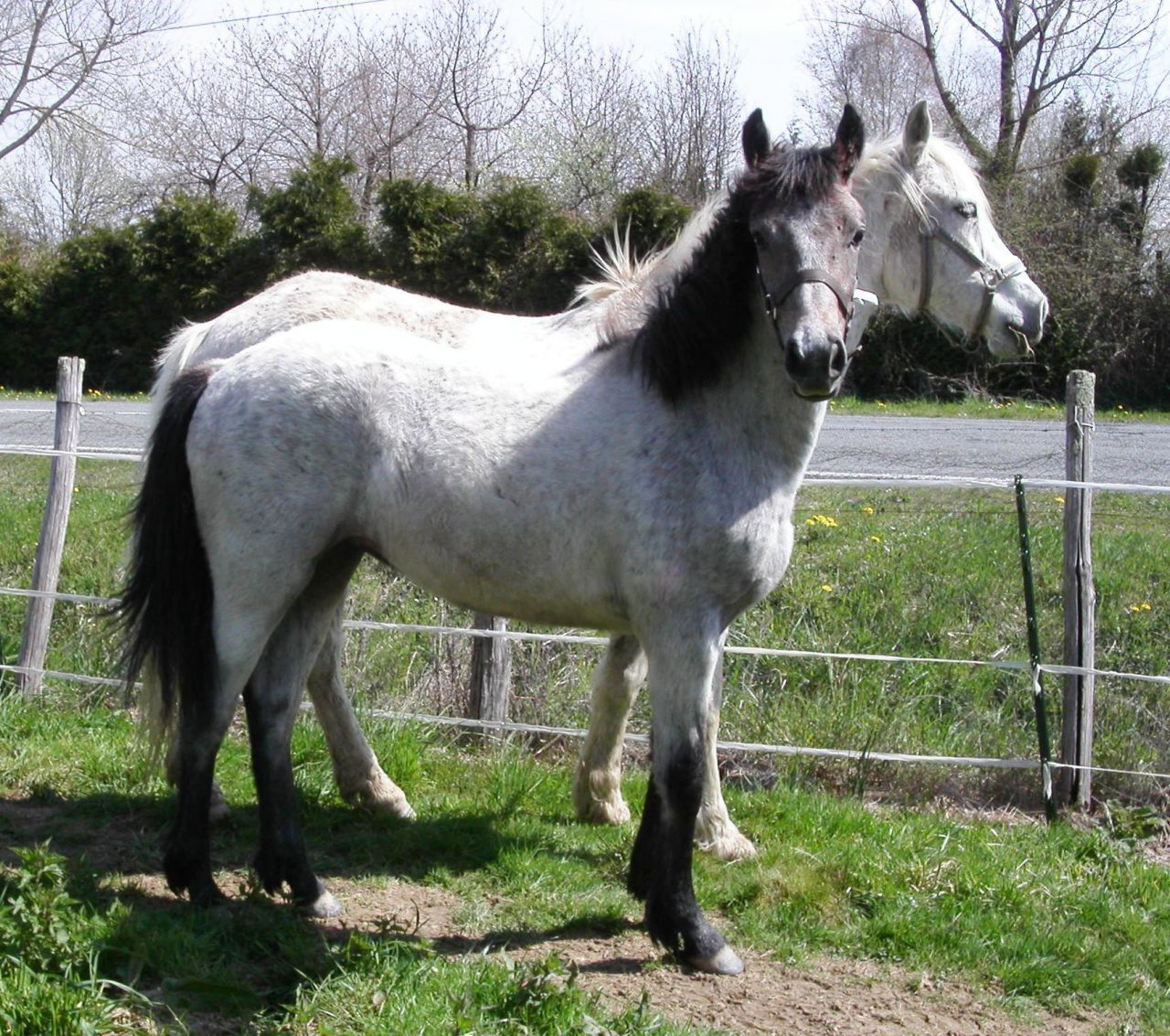 | Dire merci | Oui, je ne doute pas qu'elle finira grise, cependant j'étais habituée aux "gris foncé" qui éclaircissaient. Mon hongre était fer à 2 ans, est passé par gris pommelé vers 4 ans et a éclaircit jusqu'au blanc. Depuis ses 6 ou 7 ans, c'est le poil marron qui arrive. Il était gris truité il y a encore peu et continue de foncer... Je pensais que ma pouliche éclaircirait plus vite, d'où mon doute sur la couleur... Concernant sa mère (Ilken) elle a été testée sur le gène crème par ses éleveurs. On sait bien qu'elle n'est pas crème, mais ils voulaient savoir si elle était porteuse du gène ou non. Dans le connemara le crème aux yeux bleus n'est pas accepté. Beaucoup de reproducteurs sont testés pour éviter les mariages de deux porteurs crème... J'essaye de comprendre... il y a plusieurs couleurs de base, et à partir de celles-ci, on obtient toutes sortes de couleurs, c'est ça ?La couleur de base, est celle de la naissance ? Quelles sont ces couleurs ? Un "futur gris" peu avoir n'importe quelle couleur à la base ? |