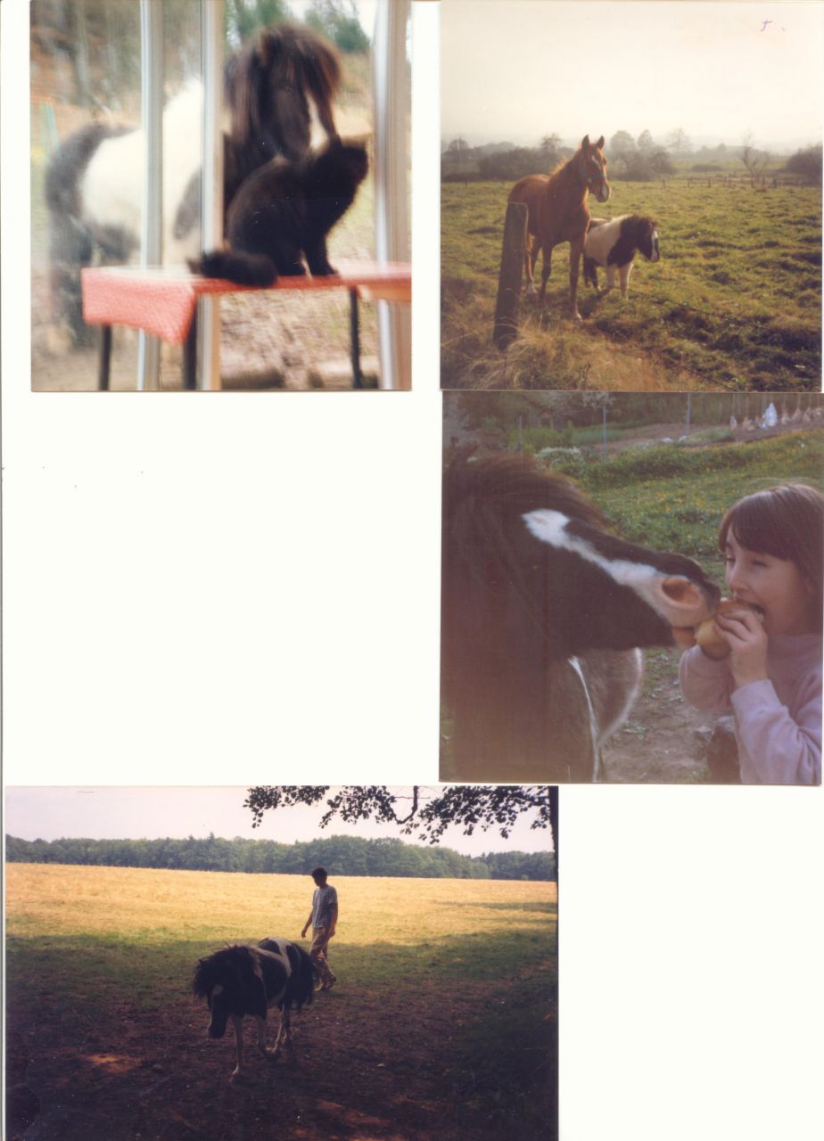 | Dire merci | MERCI MERCI Ciriolla pour la Mamie ! Donc la Mamie n'a plus de nouvelles depuis 2010 Elle avait confiée Taïs à un Monsieur qui avait le Ranch du Lac à Bouzey et voilà le Monsieur est parti sans laisser d'adresse et tous les chevaux et poneys confiés ont disparus. Merci Ciriolla d'avoir pu mettre mes photos dans un bon format, moi je ne suis pas une spécialiste en info. Derrière la photo avec le cheval alezan il y a un mot : "Le poney noir et blanc m'appartient. Elle s'appelle Taïs. Elle a 7 ans avec Tempête à Charmois l'Orgueilleux Taïs a fait un petit une ponette Eclipse du Lac avec un poney du Monsieur du Ranch du Lac de Bouzey. Taïs a été achetée par Maman en 85 au sevrage Route de Bains ou Darney dans l'élevage de Mme Laurent. Cause déménagement elle fut prêtée en 89 au Ranch du Lac à Bouzey 88. Elle a été vue dans des prés à Chaumousey et à Charmes. Derrière la grande photo du milieu il y a " Taîs fin Juillet 89" Et avec le chat noir de Maman c'était à Charmois l'Orgueilleux Taîs se promenait où elle voulait elle avait beaucoup de terrain elle voulait même rentrer dans la véranda ! |