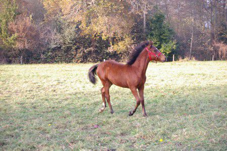 | Dire merci | Votre poulain a un chic fou. Il très bien orienté et devrait faire un très chouette cheval de sport !! j'aime beaucoup. j'ai le même souci pour la poulinière d'un bébé hanovrien gigantesque aussi chez moi, elle avait pas mal fondu avant le sevrage et se refait très bien depuis que son fils ne lui tire plus dessus |