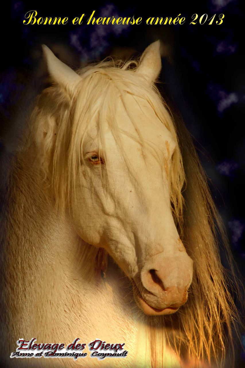 | Dire merci | ![]() Et voila l'année commence et déja mes pensées vont vers les futures poulinages cette année 2013 , 13 POULINAGES prévus sur l'élevage des dieux . - 5 de robes crème , sur , et PP Race Crème, avec de jeunes et nouvelles futures maman, mais aussi peut-être d'autres crème ou palomino ou isabelle avec nos mamans palomino et isabelle . La 1er qui devrait ouvrir le bal cette année c'est la belle MORGANE fin février gestante de TORUNHO ![]() |