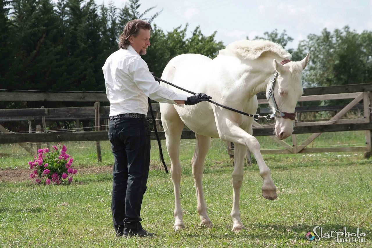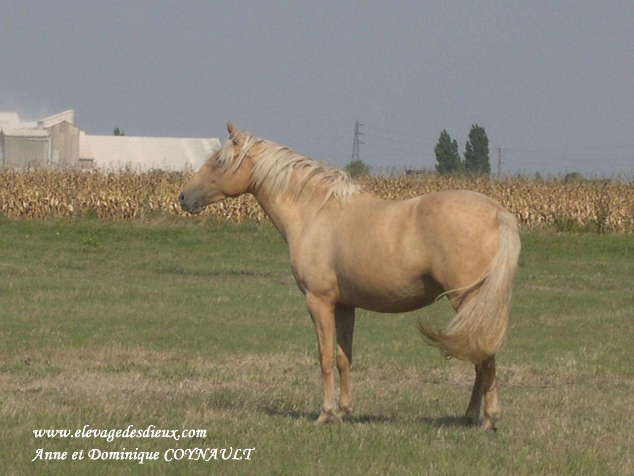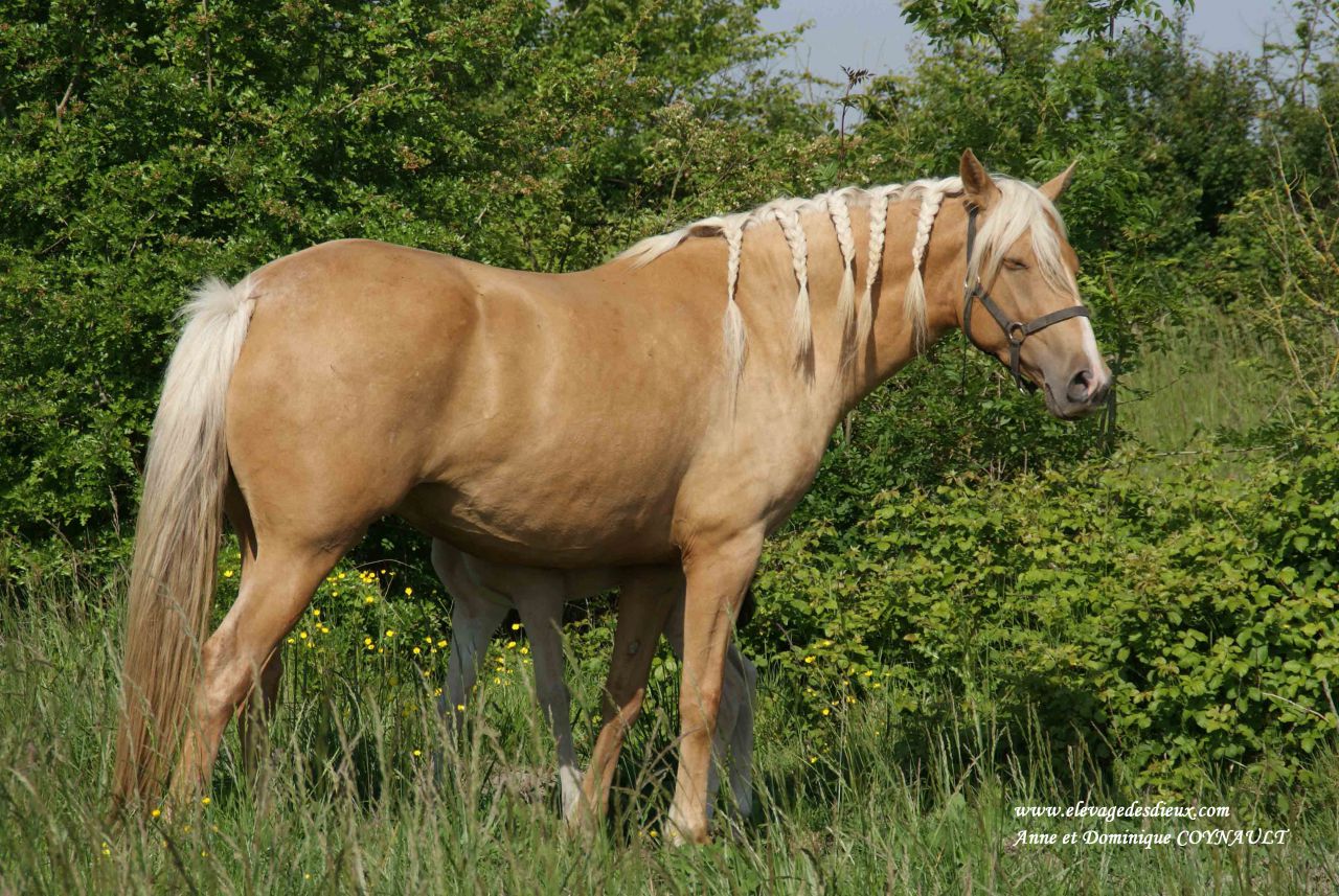 | Dire merci | Pour début avril est prévus GANDHI ( qui est vendue mais ne partira qu'au sevrage de son poulain , que je proposerais à la vente ) gestante cette année de JUANITO donc le produit sera PP Race Crème de robe crème ![]() Gandhi est aussi la mère de INDHIRA une de nos jument de spectacle et du superbe JERICO dont voici une photo ![]() |