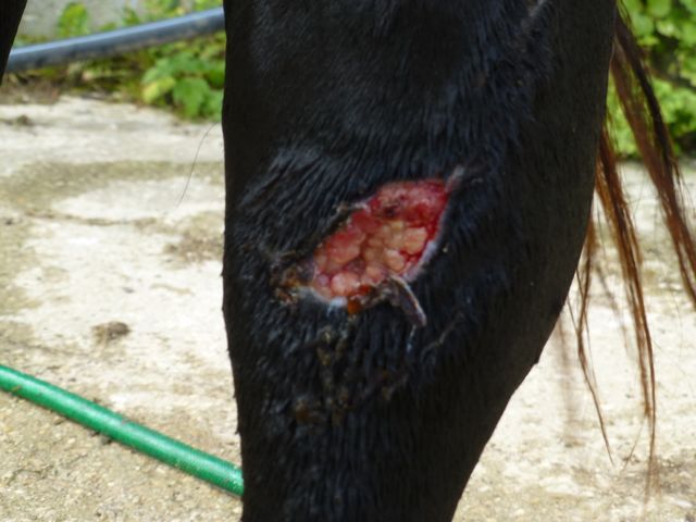 | Dire merci | Mon véto ne cous jamais une plaie accidentelle parce que ça ne tient pas et en plus ça retarde la guérison (les bords de la plaie se nécrosent à cause des trous des fils) Expériences faites: je suis d'accord avec lui! Ma jument, cet été: 5 min de douche à l'eau tous les jour, pendant un mois, ensuite, un peu moins souvent, propolis et au champs sans pansement (il y a moins de microbes que dans la plus propre des écurie) Compter 1 mm de cicatrisation par semaine ![]() |