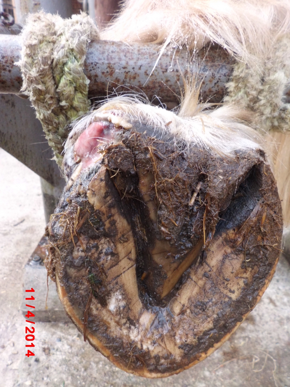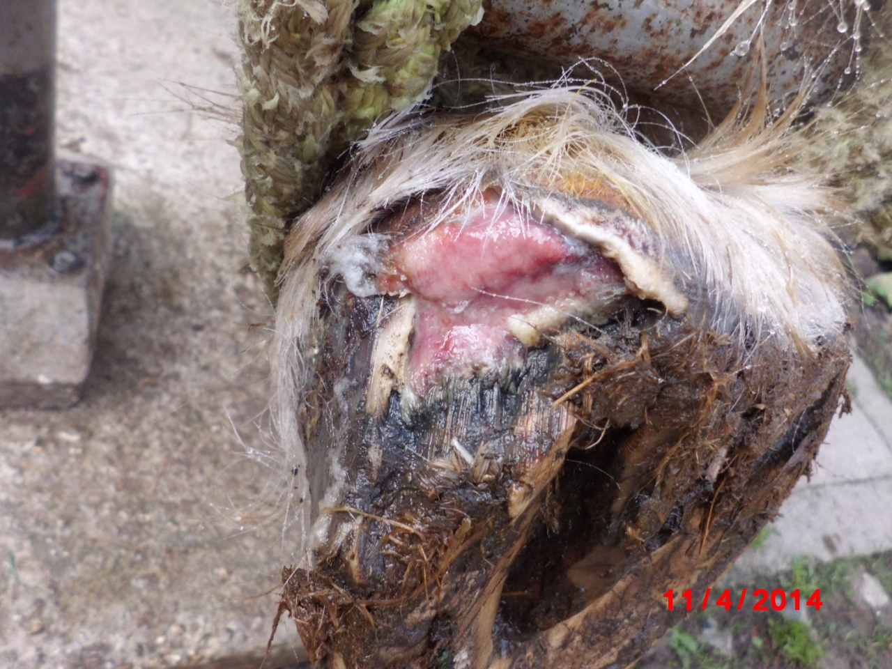 | Dire merci | Je ne comprends pas bien, les poils autour ne sont même pas rasés, ils traînent dans la blessure. C'est avant nettoyage mais le cheval a marché sans pansement, sans protection? Il faut voir avec un pareur si il n'y a pas un risque d'affaissement du cartilage vu que la boite cornée ne le soutient plus. Si il ne faudrait pas soutenir ce pied plus. |