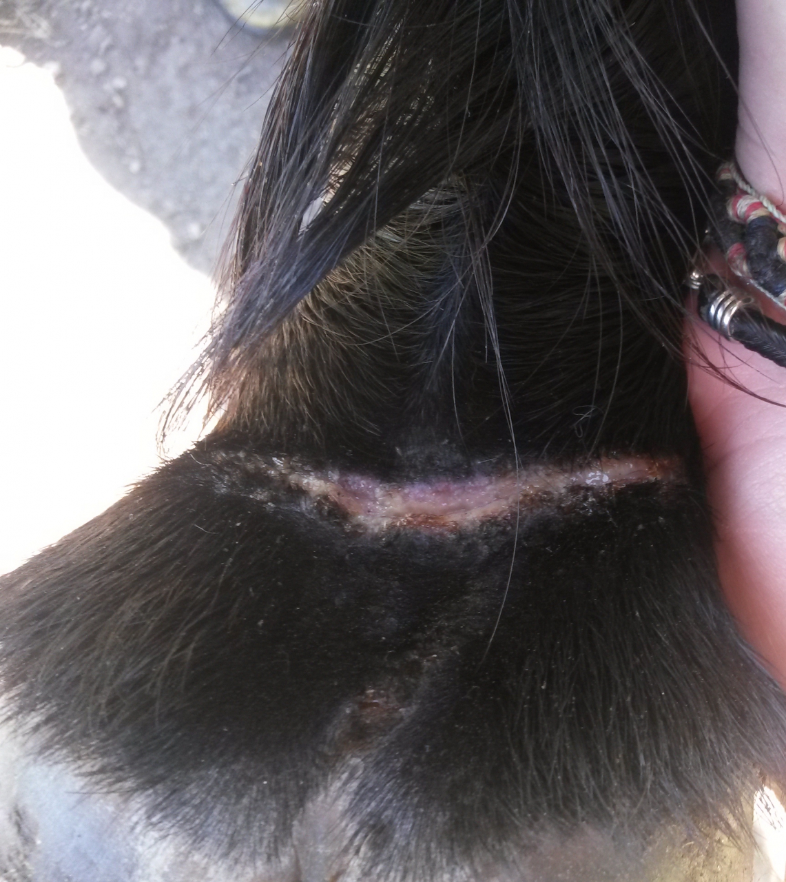 | Dire merci | je ne suis pas véto mais ds un premier temps j'y aurait tenu propre (béta rouge bien savoné rincé puis béta jaune séché et bandé avec un tulle bétadine et nettoyé et re-fais tout les jours puis à la cicatrisation tenir un pansement (si possibilité de saloperies dedans (paille fumier, sable,...) avec du cothivet et ou un corps gras selon comment la plaie se présente là c'est pas beau ça bourgeonne ... |