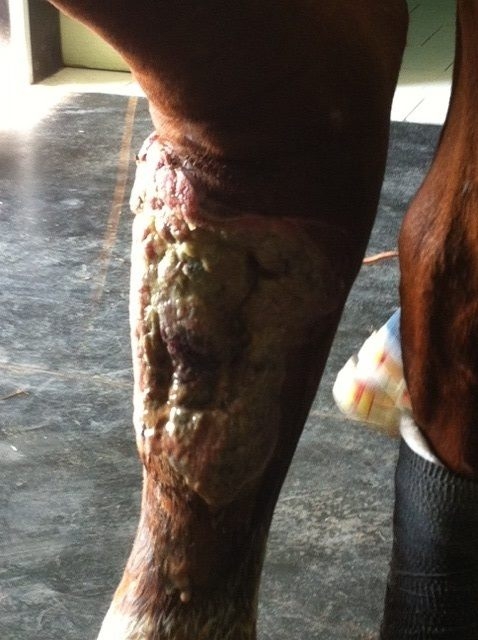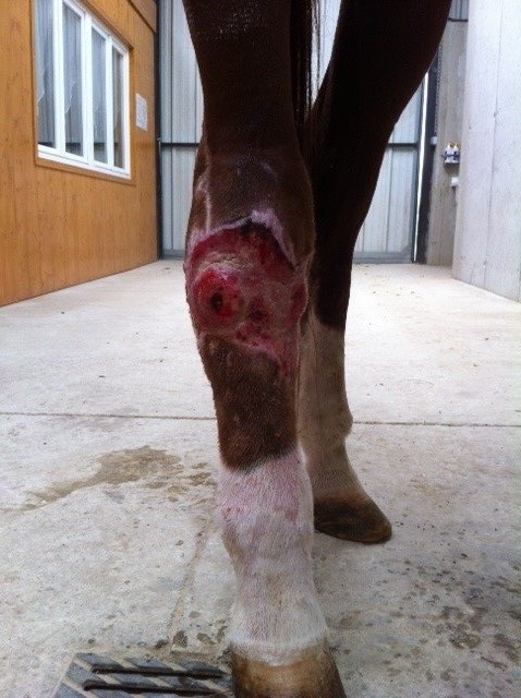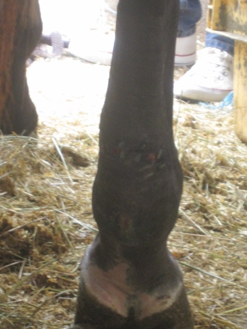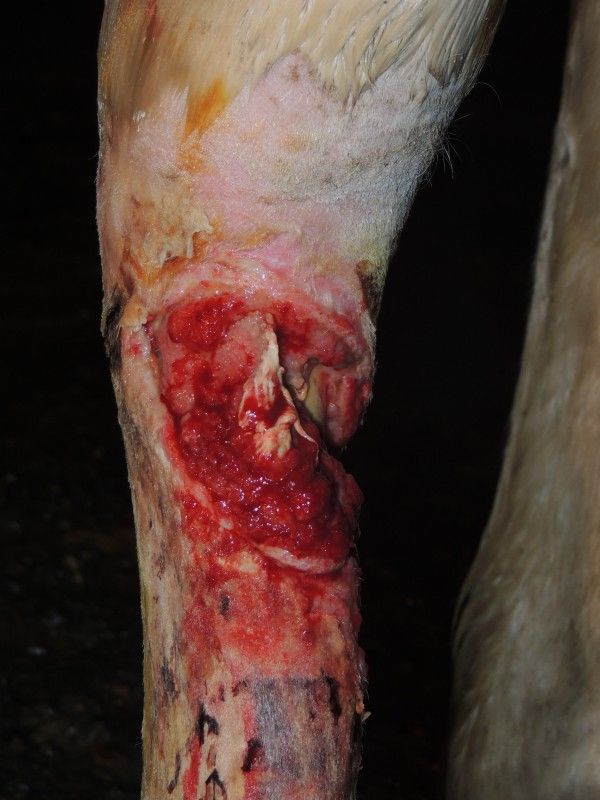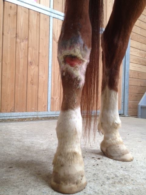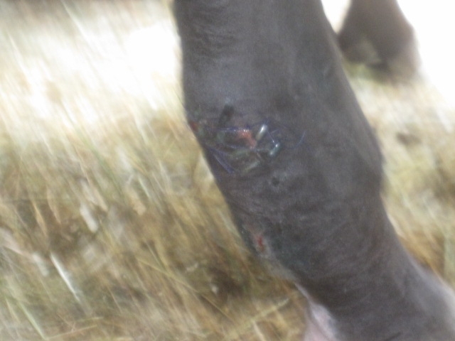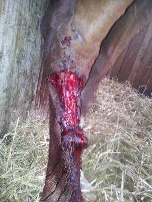 | Dire merci | Lors de l'opération de votre jument le véto a suturé les deus bout du tendon ou il a laisser comme ça. La véto m'a dit que la plaie était belle et qu'il fallait continuer comme ça de tout façon la plaie est trop grande pour faire des points même des point de rapprochement ne tiendraient pas donc on croise les doigts et on continu |