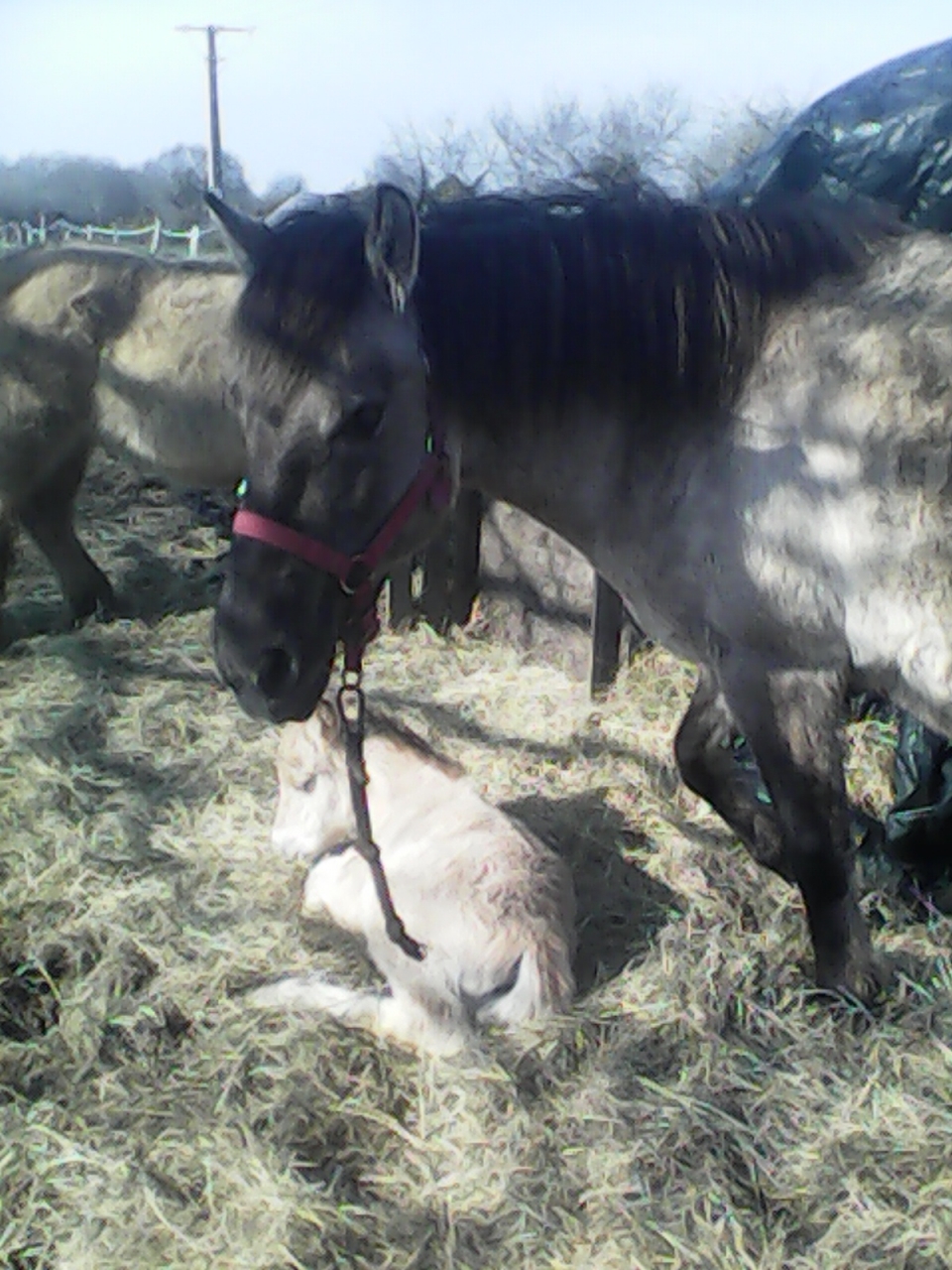 | Dire merci | On commence à voir les côtes de la maman est Golda n'est pas très en alerte. Hier elle à fait pipi dons signe qu'elle mange et elle à henni quand elle à vue sa mère. Quand elle est née elle était dans une zone plutôt boueuse. On a mis tout nos chevaux dans la parcelle en herbe. Ils sont tous au près. Se qui m'inquiète aussi c que ondine (la maman) s'éloigne souvent de Golda. |