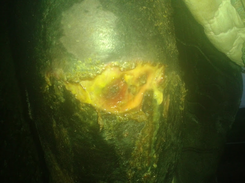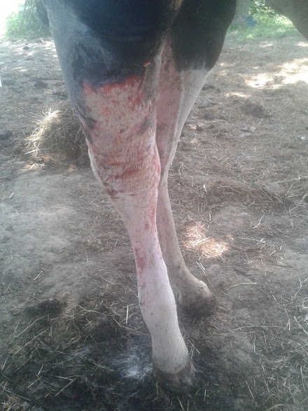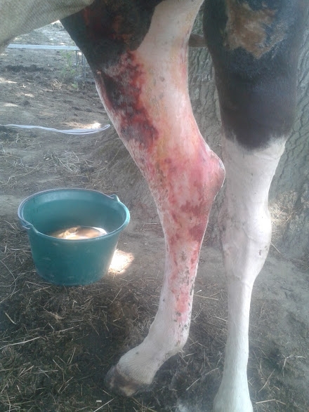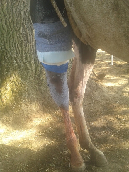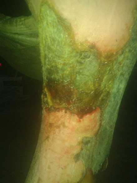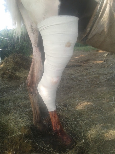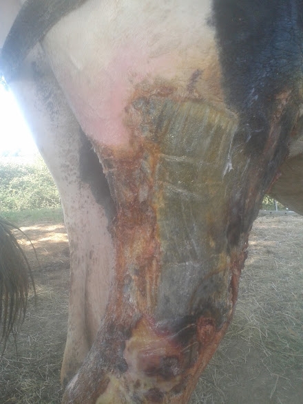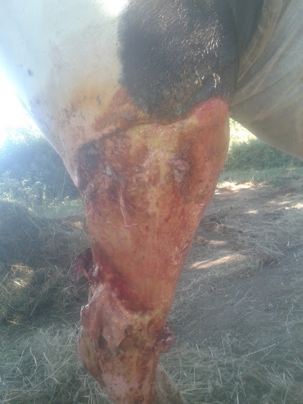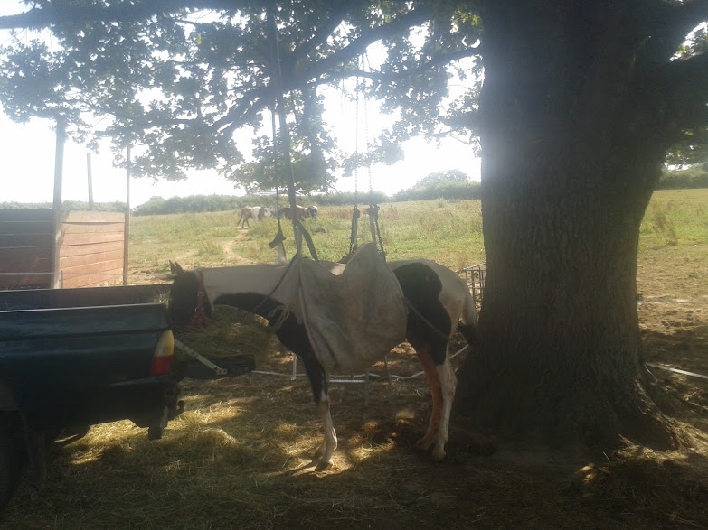 | Dire merci | Ce poste est pour montrer les dégâts, la graviter et la tournure que peut prendre une petite lymphangite. Photos choquante, personne sensible s'abstenir. C'est l'histoire de ma petite Speedy, paint horse née à la maison en 2010, -20 juin 2015: Speedy vie au pré , mais ce soir, je décèle une raideur postérieur droit, je palpe, pas de sensibilité, de plaie ou autre. Je pense à un faux mouvement, donc: douche, repos et surveillance. Jour 2: Toujours raide mais aujourd'hui elle présente un œdème sur le grasset....je pense à un coup mal placé d'un copain. Je douche et application d'argile marine, j’appelle le véto...aucun n'est disponible et vu qu'elle mange, n'a pas de fièvre et qu'elle s'appuie sur sa jambe....le véto n'estime pas que c'est une urgence, donc il ne passera que demain. Il me dit de continuer les soin que je fait. Dans la nuit l’œdème prend toute la jambe et Speedy se couche, c'est le début de la galère. Jour 3: La nuit à été longue, speedy n'arrive pas à se lever seul, on la tourne toute les deux heures, on l'abreuve, la masse, en espérant une amélioration. On continue toute la matinée, on déplie une tonnelle pour qu'elle soit à l'ombre car sa cogne. Le véto passera dans l'aprem malgré mes appels insistant. Il arrive vers 15h, Speedy n'est pas en forme, elle n'arrive plus a se lever et même le fait de se mettre en "vache" est impossible...on la tourne, on lui met de la paille pour amortir le sol qui est dur vu la canicule. Elle est déshydrater, malgré les litres de flotte qu'elle boit, donc perfusion en grande quantité. Le véto pense à un coup. Ne pouvant plus la relever à la force de nos bras, je demande à mon oncle de venir avec tracteur et sangles, on galère, mais elle est debout. |