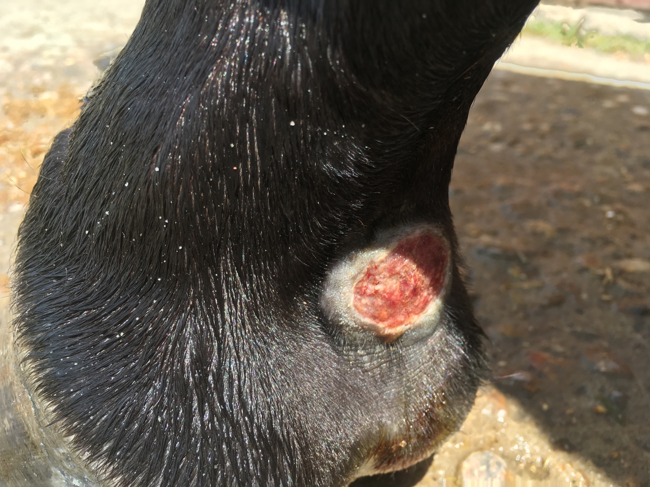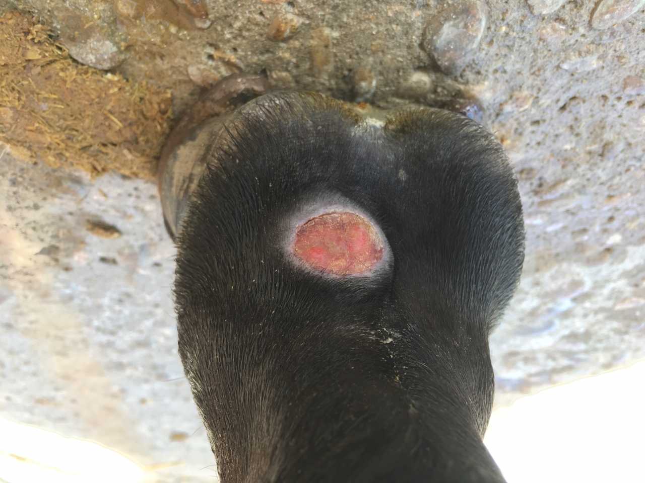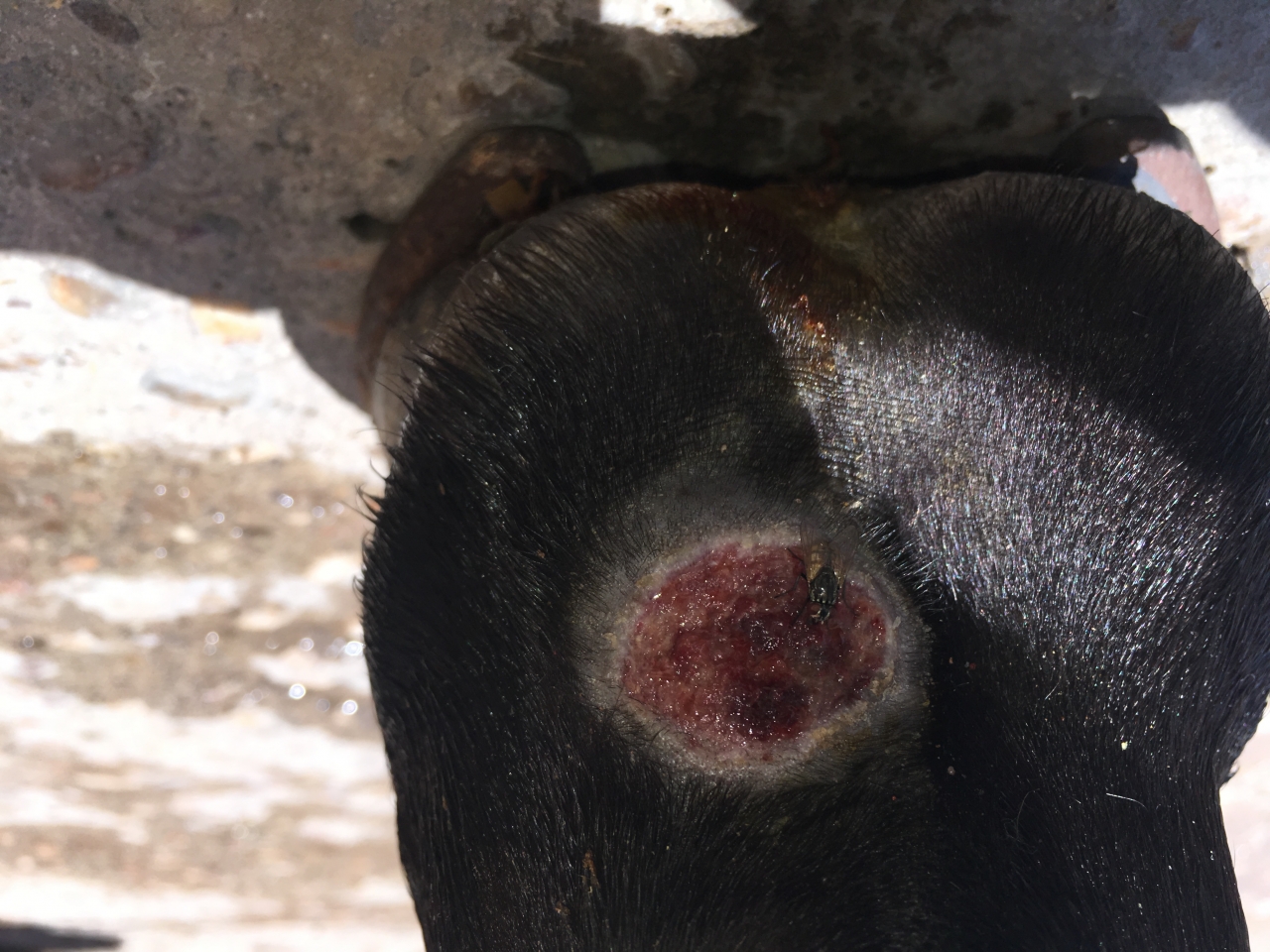 | Dire merci | la plaie est loin d'etre vilaine. perso, à ce stade, je me ccontenterais d'appliquer du Tiphene pour proteger des mouches, et surveiller un potentiel bourgeonnement |