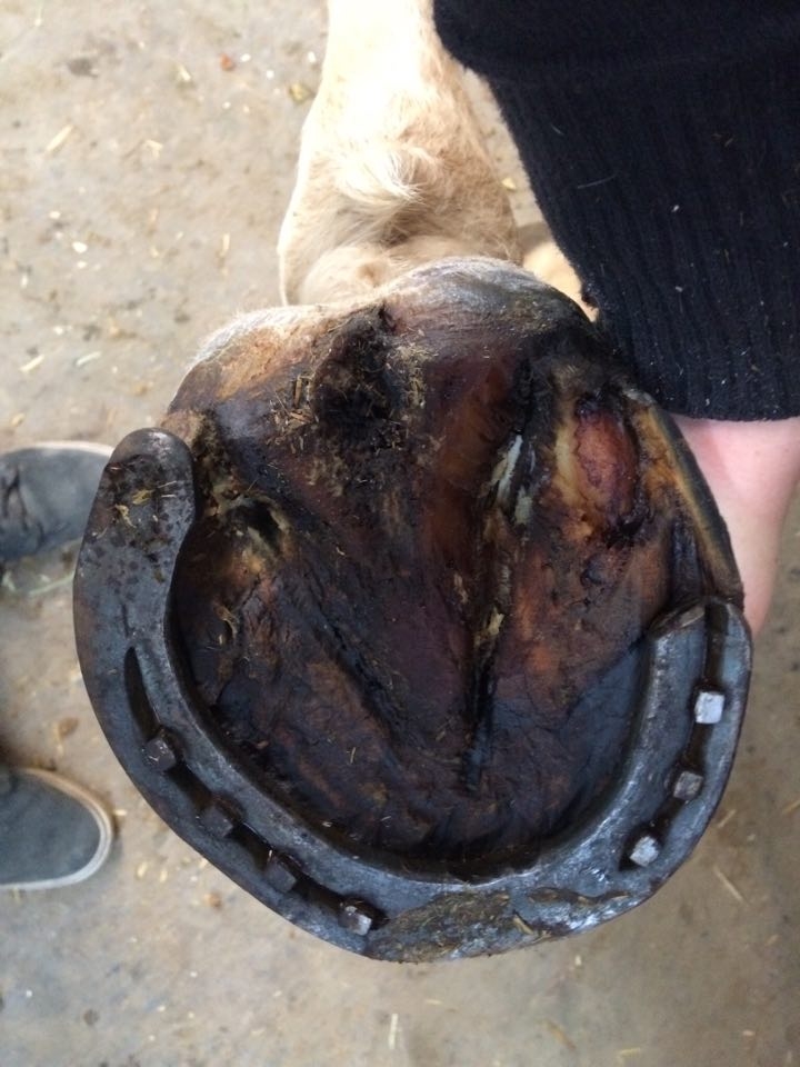 | Dire merci | Généralement quand le pied pourrit, il y a l'odeur qui va avec : ça sent vraiment très mauvais ! J'ai passé 2h ce matin à soigner les sabots de mes deux chevaux qui vivent dehors avec abri. Il pleut depuis plus d'un mois et le dernier parage date d'octobre. Curer, nettoyer la boue... Enlever avec la renette toutes les parties pourries (corne noire, ou blanche qui s'effrite), élargir les lacunes de la fourchette et tailler les barres... Et j'ai testé un truc magique : le goudron de Norvège en spray !! Tellement facile d'application alors qu'au pinceau, sur un sabot humide, c'est même pas la peine d'essayer... Je suis enchantée ! Mes loulous ont 8 sabots nickels maintenant ☺ Je vous dirai dans la semaine si c'est vraiment efficace pour stopper la pourriture. |