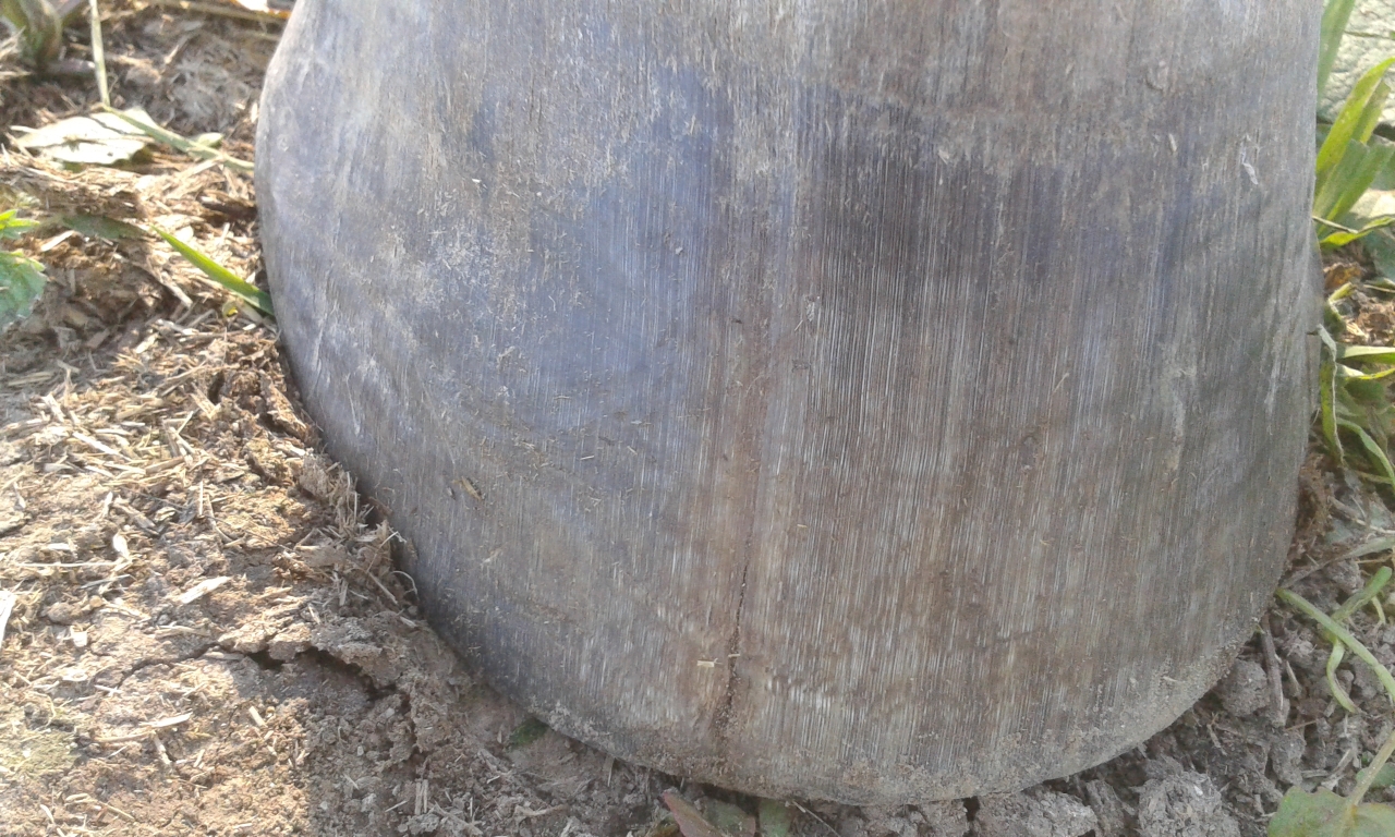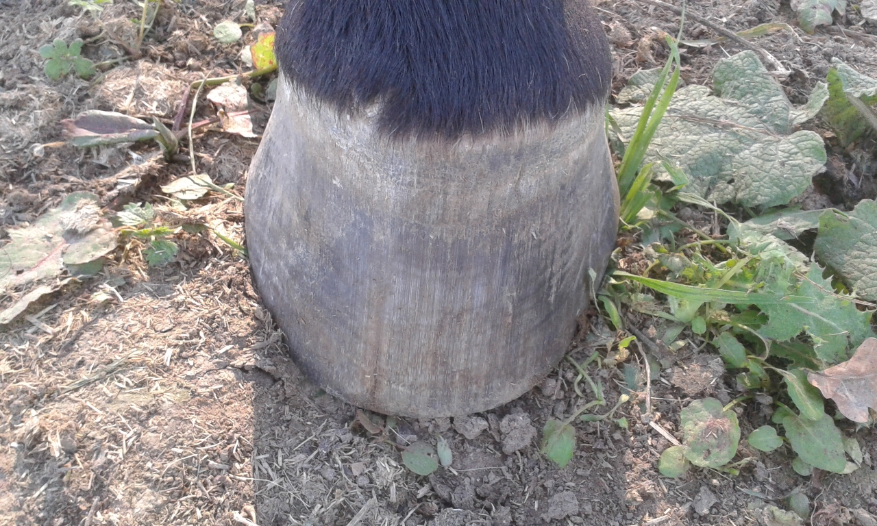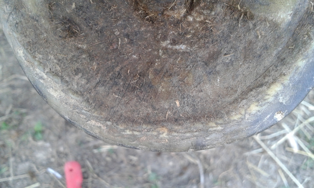 En ligneDire merci | Pour supprimer l'appui tu fais en bas avec ta râpe une petite encoche de façon à ce que la sole ne touche plus le sol là où il y a cette petite fente. Et à voir comme ça j'ai l'impression que ton parage n'est pas tout à fait équilibré. Égalise bien l'épaisseur de la paroi (à droite sur la photo du dessous) et fait un bel arrondi/léger chanfrein du rebord. |