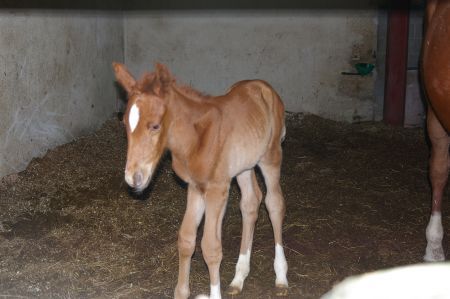Déconnecté | bon il s'est quand même levé mais à 2 heures de l'aprés midi aprés avoir eu plusieurs biberons maintenant il tète tout seul seulement il faut tenir la jument qui fait que bouger enfin il parait qu'elle va s'y faire. On ne sait pas trop pourquoi il n'a pas reussi à se lever, il a essayé dés sa naissance et cela à duré plus d'1 heure et je pense qu'il a du s'épuiser car il n'est quand même pas trés gros je dirai qu'il est même trés maigre mais il se rattrape et il tète bien je retourne le voir cet aprés midi car je travail jusqu'a 4 heures je n'ai pas eu de nouvelles ce matin donc c'est que tout va bien...Je vais essayer de vous mettre des photos. Quand au nom on hésite avec Univers ou Acquis les 2 parents sont Selle français mais d'aprés la simulation que j'ai fait sur le site des haras ce serait un anglo arabe (bizarre) et si c'est un AA je ne suis pas obligée de le mettre à la lettre. |