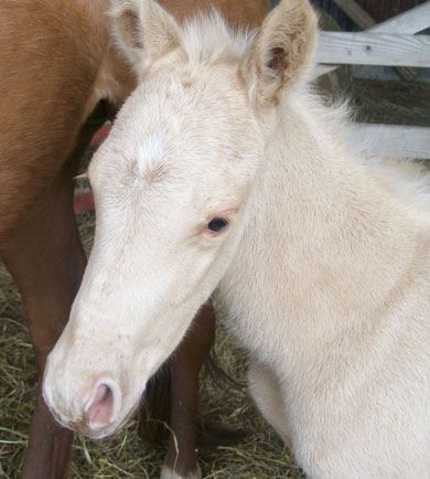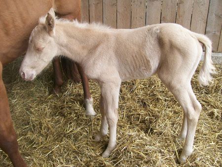| Dire merci | tous les alezans ont la peau rose à la naissance, les palo c'est pareil, c'est d'ailleurs comme ça qu'on distingue un palo d'un isabelle à la naissance, car certains isabelle ont les crins si pâles qu'on s'y tromperait... pour moi ce poulain est clairement palomino, clair certes, mais palomino. à l'inverse, ce(rtains palominos naissent si foncés qu'on les croit alezan. ![]() |