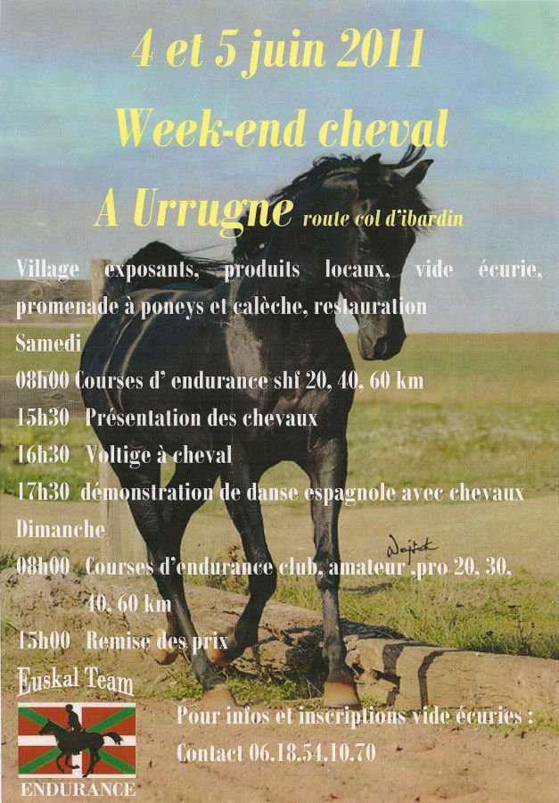 | Dire merci | La jeune association Euskal Team Endurance organise son 1er concours le we prochain, date limite des inscriptions lundi soir. Bonne ambiance, belles boucles ![]() N'hésitez pas à contacter Francis, il s'occupe de tout ![]() ![]() Lien |