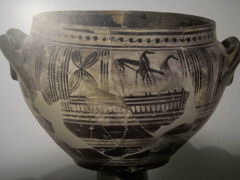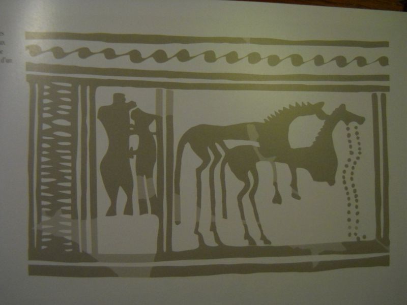 DéconnectéDire merci | Allez, l'image d'un vase géométrique (VIIIème av.) grec récemment exhumé qui illumine, à mon avis à merveille, nos propos. Ou comment contrôler sa descendance et assurer son pouvoir, et le dire par le cheval. Il s'agit d'un vase funéraire d'un éleveur de l'époque: c'est une sorte de nécrologie du défunt avant l'heure. La face A: ![]() Et le dessin de la face B, parce que le vase est en mauvais état: comme c'est tout de même assez difficile de lecture, le panneau à gauche présente un accouplement humain. ![]() Et une spéciale pour Chems, dans le sujet du cheval de guerre. ![]() Vous remarquerez le couvre-rein. |