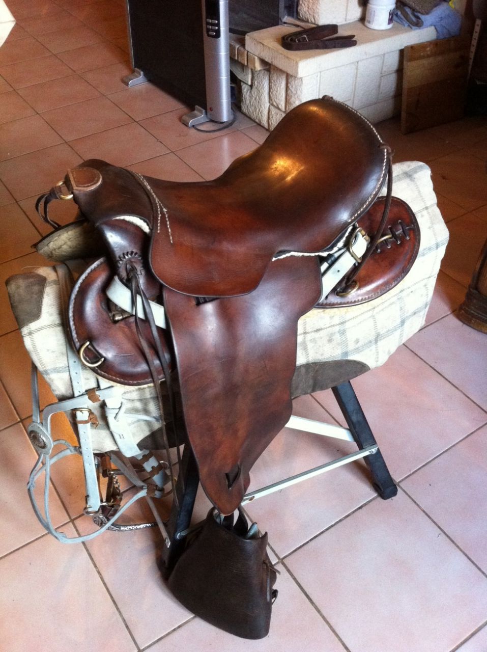 Déconnecté | Si jamais ça t'intéresse, j'ai une selle oner à vendre. Voici l'annonce Ces selles sont rares, fabriquée par le sellier ONER aujourd'hui disparu. Les panneaux anatomiques sont mobiles, offrant donc la possibilités de s'écarter ou de se resserrer. Ils s'adaptent ainsi à un grand nombre de chevaux ou aux chevaux dont la morphologie change selon les saisons ou la croissance. L’arçon est fait en résine synthétique, ce qui le rend solide à vie (pas de risque qu’il vrille). Le sanglage 3 points de type Mc Lellan permet de répartir la charge du cavalier en plaquant la selle parfaitement sur le dos du cheval (refait à neuf avec un cuir chromé de qualité). Elle est d'un grand confort et la position à cheval est idéale pour la randonnée, l'endurance ou le trec (nous avons rajouté une couche de mousse sous le siège pour encore plus de confort). Elle donne une assiette sûre dans toutes les situations grâce à un siège assez creux (idéal pour les débourrages). Le cuir est de qualité et la selle est entièrement démontable, idéal pour l'entretient, les réparations ou les modifications. |