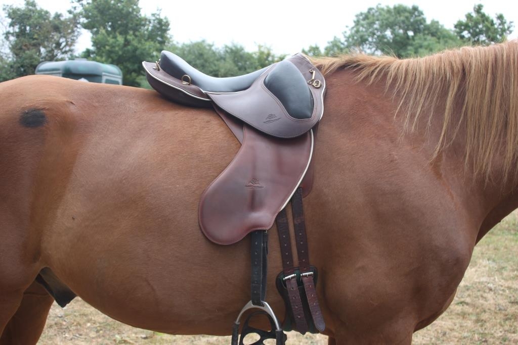 | Dire merci | Bonjour à tous, j'ai besoin de vos conseils concernant une selle pour mon mari et son trotteur, 164 cm, modèle éclaté, que voici après un entrainement avec la fameuse selle Margeride, taille 17 pouces ouverture 24 :![]() La sellerie Gaston Mercier nous a très gentiment envoyé cette Margeride à l'essai, et une Florac ouverture 24 aussi mais 17 pouces 1/2, trop grande pour nous. Nous courons gentiment en club, jusqu'à 40 km. Mon mari est hyper bien dans la selle, qui lui permet enfin d'avoir une fixité de jambe lui permettant de suivre le trop de Rapide, qui "déménage", d'une manière bien plus agréable. Le cheval a l'air bien aussi, mais voilà, la commerciale qui a demandé des photos, pense que la selle est trop large et préconise une ouverture 23, ce qui me parait peu. Qu'en pensez vous? D'autre part l'arrière de la selle ne repose pas sur le cheval, bien que la sueur soit équitablement répartie sur la surface porteuse. Les fameuses photos: ![]() ![]() ![]() ![]() |