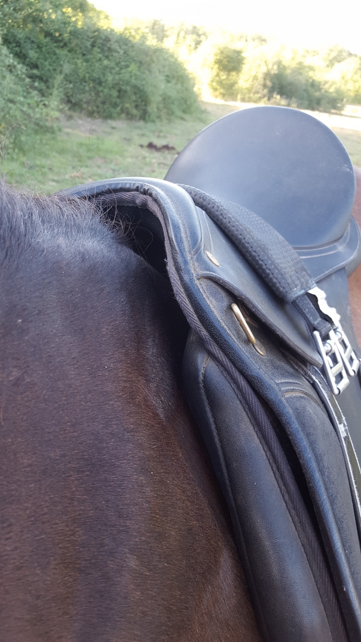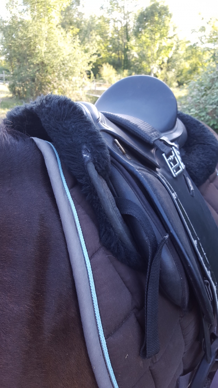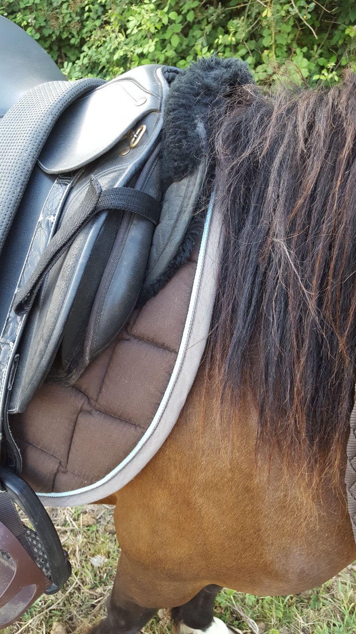 | Dire merci | Bonjour, J'explique vite fait ma situation. J'ai une jument Welsh Cob/Sport d'1m35 qui est normalement assez fine et très muscler (il y a 1 ans/1 ans et demi, après elle a pouliné et s'est blessé, bref...). J'ai déménagé en février et je n'avais pas encore le terrain avant, mon oncle ayant aussi des poneys a donc accepté de garder mes 4 poneys, sauf que depuis février elle n'a quasiment pas travailler. Donc elle a normalement un dos beaucoup plus muscler, pareille pour le garrot et le reste. Passons à la réel question. J'ai reçu il y a peu une selle Wintec 500 Cair mixte (ancien modèle) avec dessus l'arcade blanche (XL). J'ai été voir ma jument hier, j'ai donc essayé la selle et voici ce que ça donne sans rien (juste la selle). ![]() ![]() ![]() ![]() ![]() ![]() Je passe 3 doigts vraiment juste, je suis obligé de repousser la selle car le pommeau retombe. Voici maintenant avec un tapis et un amortisseur : ![]() ![]() ![]() ![]() ![]() ![]() ![]() |