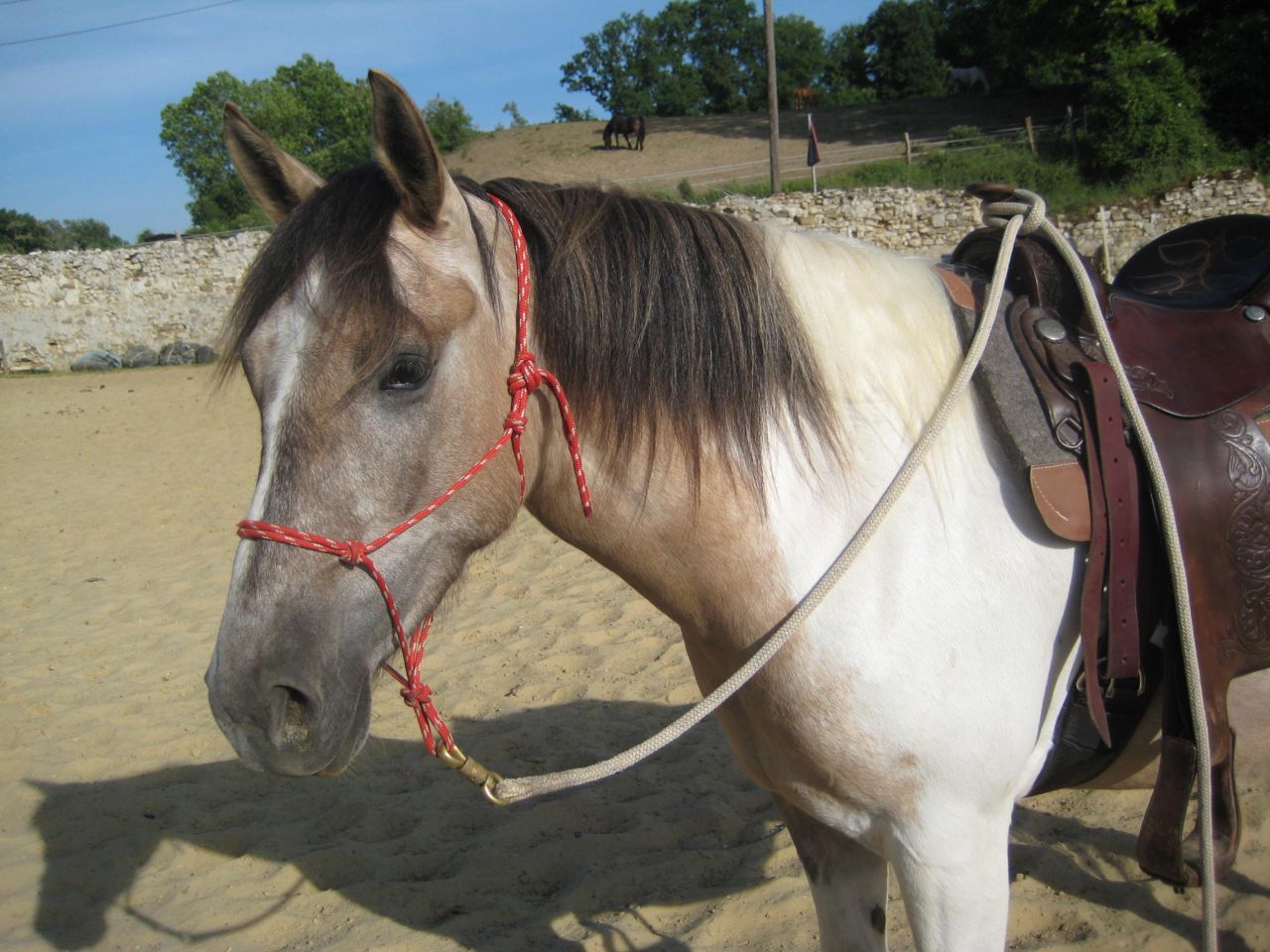 | Dire merci | Nouvel essai aujourd'hui après avoir enlevé le 2ème passant (j'ai bien galéré soit dit en passant!! )Cette fois on a bossé en carrière, et super, la jument répond aussi bien qu'en licol étho. Bon elle a 4ans donc on fait pas non plus des trucs compliqués, mais super! Du coup j'ai voulu sortir faire un tour pour voir si c'était mieux... Sauf qu'elle était redevenue normale, elle a même pas essayé de brouter, donc je ne sais pas si j'aurais réussi à l'empêcher Jeudi, balade à 2 aux 3 allures pour voir comment ça se passe, je pense que je mettrai un mors (j'ai aussi pris les montants ) pour avoir un frein au cas où elle déciderait encore que c'est la fête!! ![]() En tout cas il y a pas mal de monde qui me dit que c'est trop laid, mais moi je trouve que ça lui va trop bien!! ![]() ![]() |