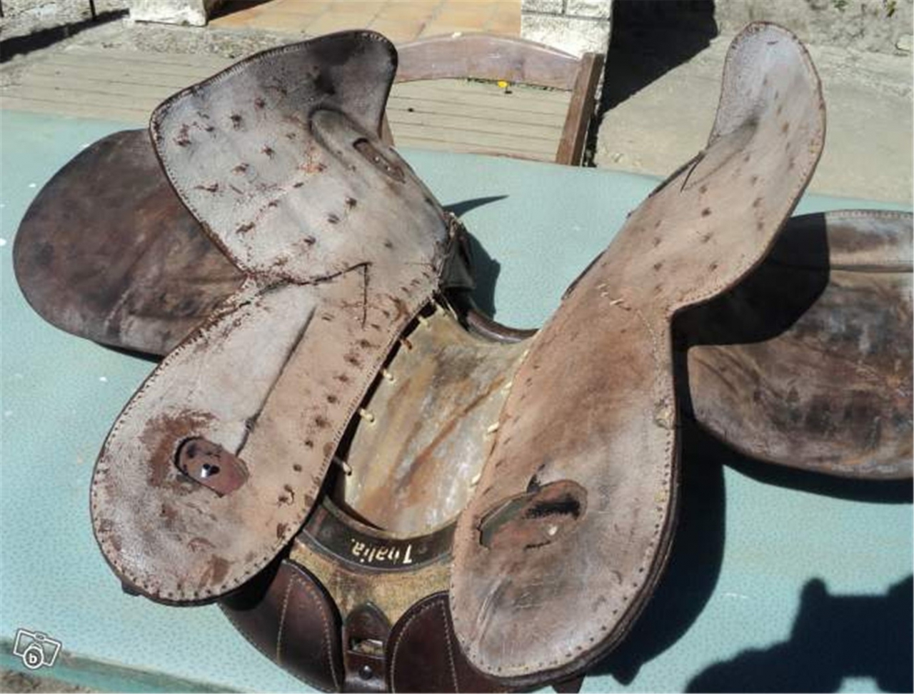 | Dire merci | voici ma selle WW2 taille 5 restaurée, elle conviendra désormais plus à un cheval ayant un dos plus large que Sarah ( je ne lui ai pas encore essayée ). Des photos seront faites ce week-end![]() Heureusement qu'il y a une bourrelière dans ma pension car elle serait toujours dans l'état d'achat. |