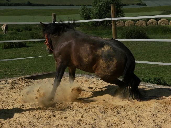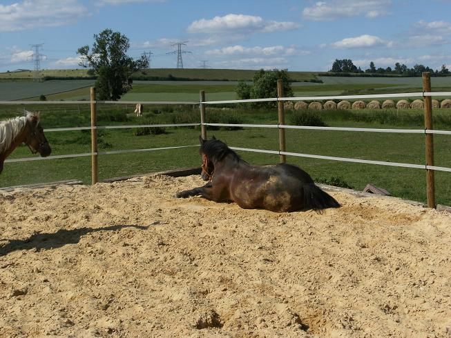 | Dire merci | Sinon, en hiver je le lâche dans le manège et je n'a même pas besoin de lui "coucher" il le fait d'office ! Cooooooooooooool |