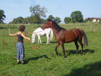 | Dire merci | Héhé ! Encore un petit pas ... En suivant bien vos conseils pour arriver à faire un cercle plus propre et plus posé, j'ai commencé par faire courir la crevette ... ça donne ça : [videos]1823[/videos] Puis, on passe le licol, on se met dans un autre pré... et là, ooooooooh, miracle, la nuit à fait germer le début d'apprentissage de la veille... je pointe, elle tourne... au pas !!! Bref, que du bonheur, quelques tentatives d'arrêts intempresifs ou de changement de sens, mais rectifiés sans contact du sticks ! Bon, pas de vidéo de la séance... peut-être demain... Et après... et bin devinez ?? ON COURRE !! [videos]1824[/videos] |