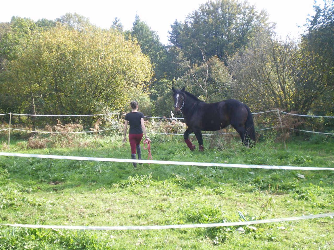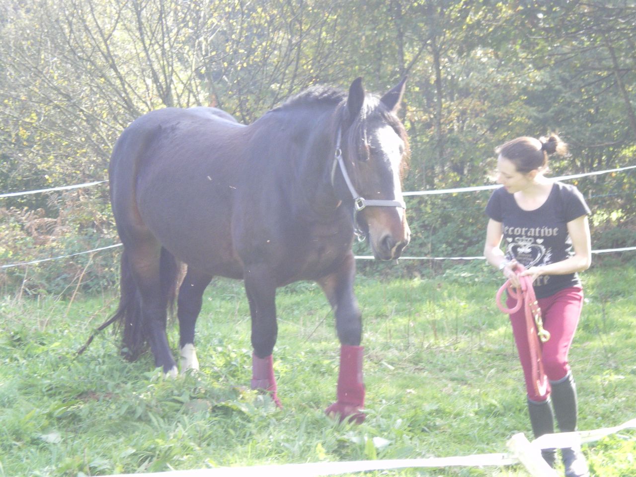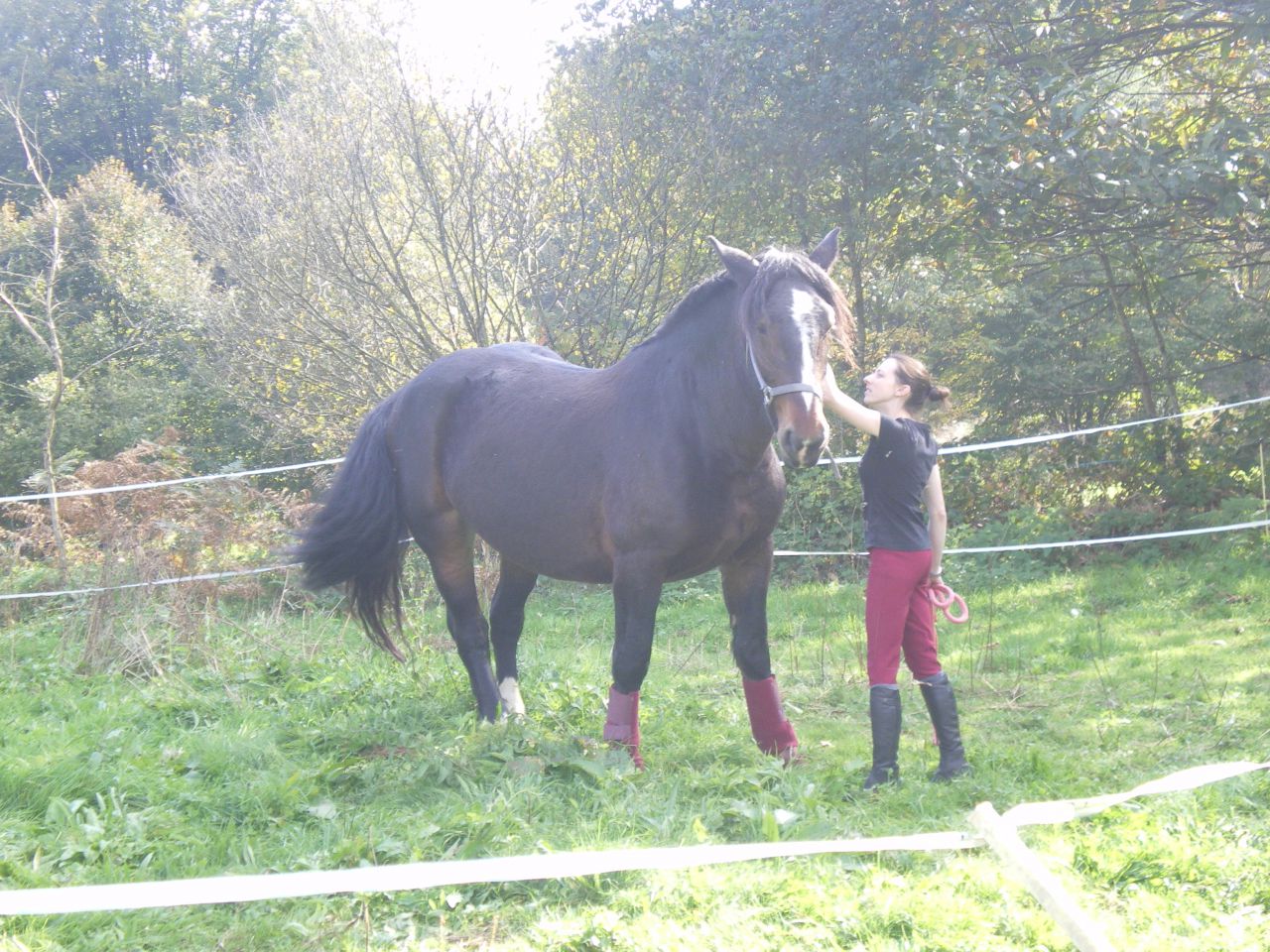 | Dire merci | oui c'est exactement ça! c'est pour ça que je n'insiste pas, car en effet du mal a sentir le moment ou ça va trop loin pour elle et ce qu'elle peut accepter. elle est de bonne composition, gentille, pas "vicieuse" pour deux sous (les chevaux "vicieux" existent-ils?) mais y'a des moments ou on sent bien qu'elle n'arrive plus a gérer la pression. bon puis vu son gabarit j'ai pas envie de "m'amuser" en essayant des trucs par contre pour certaines choses elle reste super zen, elle avait les protec pour la première fois sur ces photos et elle a super bien géré, quand je lui ai coupé la crinière (aux ciseaux, et ça a été long et bruyant!) elle n'a pas bougé une oreille, elle ne prend plus la main quand on la change de pré (le moindre petit truc la faisait partir plein cul, ça a mis du temps pour qu'elle arrive a rester zen) y'a quand même des moments ou elle se contient. mais vraiment super gentille ![]() |