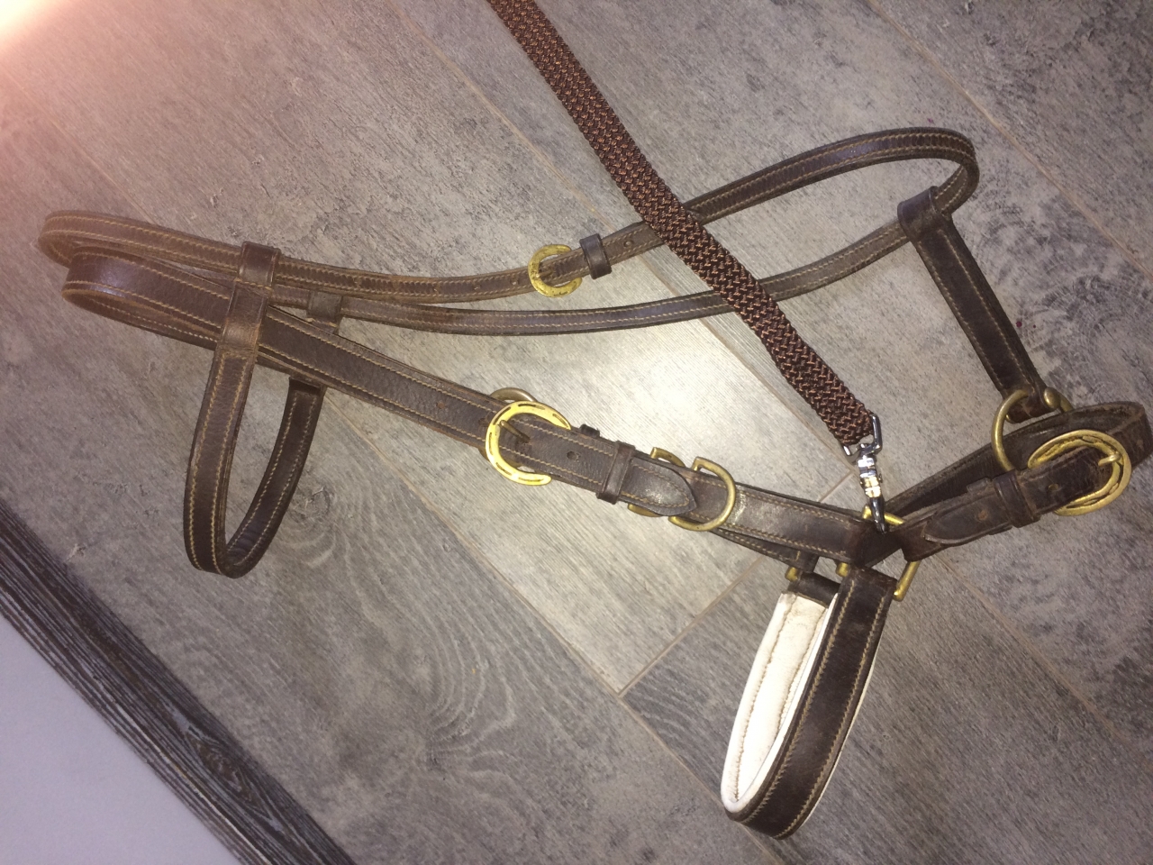 | Dire merci | Après ton licol n'en ai pas tout à fait un, à l'origine c'était sûrement un bridon-licol de rando car il y a les anneaux sur les montants pour attacher les mousquetons des montants du mors. |