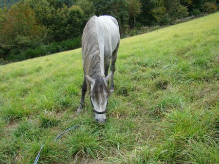 | Dire merci | ben, moi je trouve que c'est mieux au moins 1m derrière [URL=http://www.casimages.com] [/URL]là, il est même encore un peu près quand ça lui reprend de coller, j'emmène un stick, et je le tiens à hauteur de ma hanche; de temps en temps, je le lève; s'il touche, c'est qu'il est trop près, et comme on est dans une période de mise au point (voir mon post "cheval qui tape" , ben il sait que j'ai pas envie de rigoler avec ça;la distance c'est ta garantie sécurité, ça te donne un peu de temps pour réagir, ça te permet de passer des obstacles... et pis il respecte ta bulle donc il te respecte; je pense que c'est sûrement de l'enthousiasme de la part de ton cheval, mais c'est mieux pour tout le monde s'il est plus loin; sans compter que si tu vas sur la route, c'est aussi plus cool s'il est derrière; |