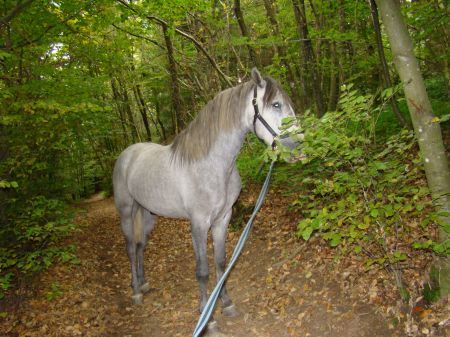 Oh j'oubliais, je l'ai depuis deux semaines seulement, on est parti que deux fois pour le moment, on fait des trottings sur des portions de plat, on est en forêt donc un coup ça monte et après ca redescend, et on croise des motos cross, des quads, des ânes, des poneys et des chiens, et il dit rien mon bébé. |