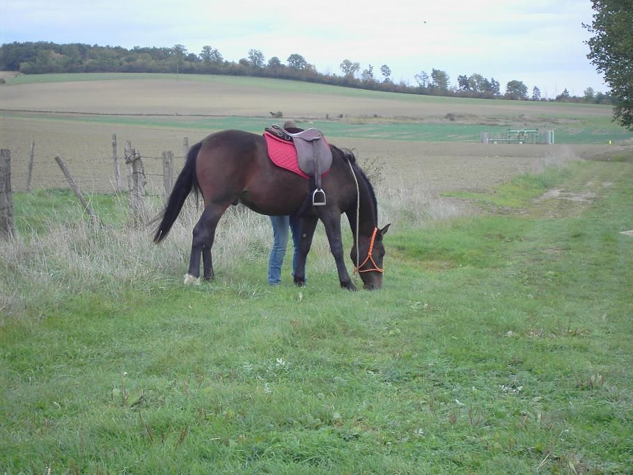 | Dire merci | licols en corde, pour nous... pour le brouting intempestif... voir les contrats de vsv pas de souci pour brouter, mais c'est moi qui dit quand et où; si il essaie, je l'occupe un max, direct un désengagement, par exemple; bon les routes sont pas très passantes, ça aide; détail qui a son importance: quand on partait en balade, c'était des fois un peu dur de l'empecher de brouter, des fois fallait se battre; le 12/09, je me suis ramassé mon 6e coup de savate de la part de mon grand escogiffe... remise de pendules à l'heure pour tous les deux, pression maxi dès le moindre indice de "respect en chute"...ben vous allez pas me croire!!! plus de tentatives de brouting!!! j'ai plus rien à faire!!! c'est pas beau, ça? alors le brouting: "j'ai faim" ou "j'm'en fous je fais c'que j'veux"...? la question est ouverte... ![]() |