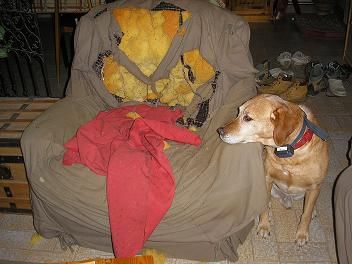 | Dire merci | Des ptites photos pour rigoler, pour faire oublier les petits maux à celles qui ont besoin. Les dernières de Tanplan, le chien tout penaud devant sa bêtise. Le jour de la pleine lune, il a bouffé le fauteuil,avec le tps pas top il sort moins et il est un peu sur les nerfs. Il vient de la spa (on comprend mieux), mais il faisait ça surtout la 1ère année(chaussons, canapé, télécommandes, poubelles ...). Sinon, l'avantage de ce chien c'est qu'il est fructivore. Il saute rachement haut pour bouffer les kakis. A + ![]() |